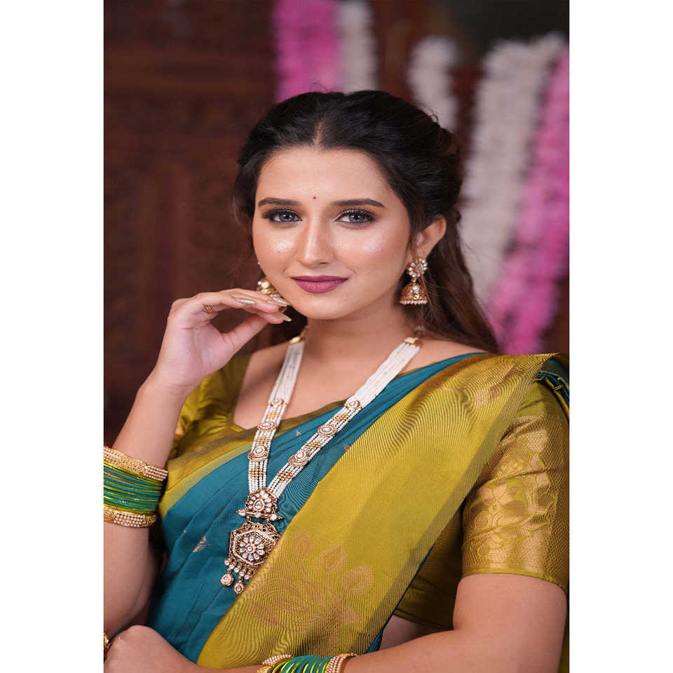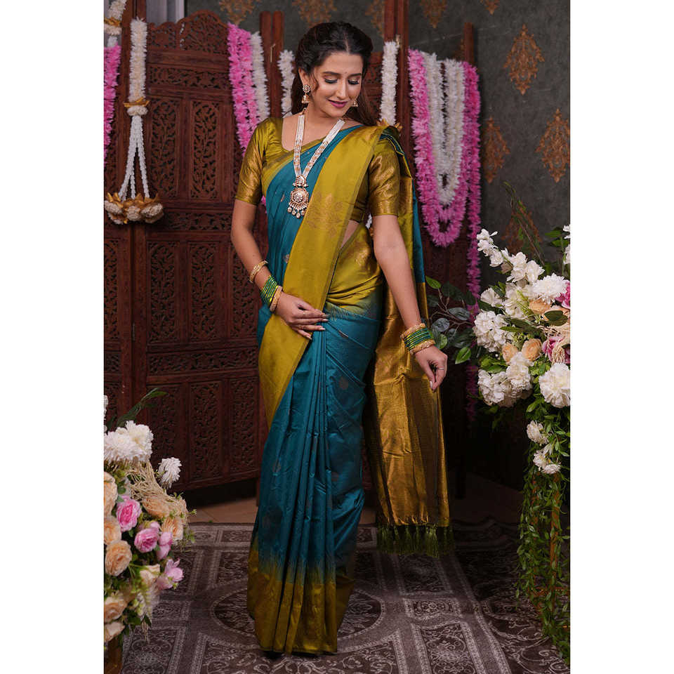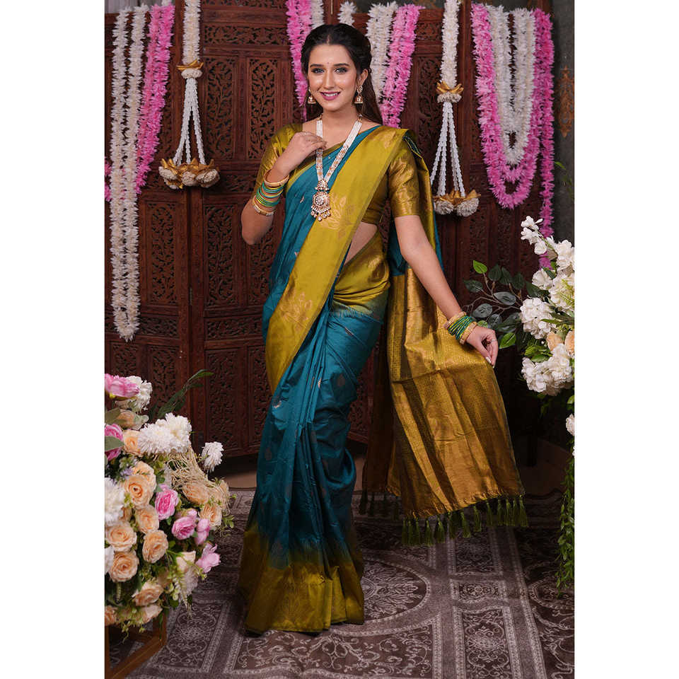 ผ้าไหมเนื้อนุ่มสีฟ้าทะเลลายทอเอลีทวีฟส์ พร้อมขอบลายดอกไม้ปักดิ้นทองสำหรับงานแต่งงาน