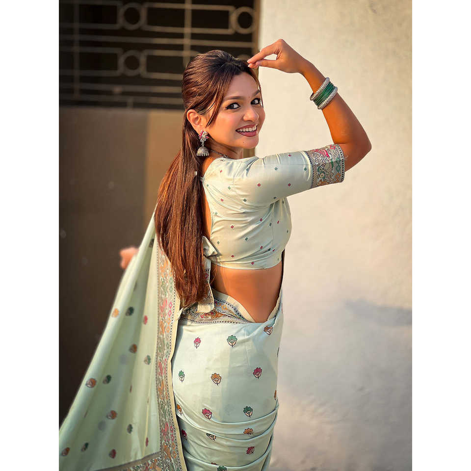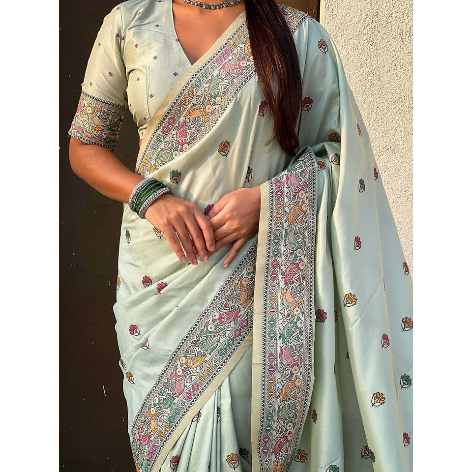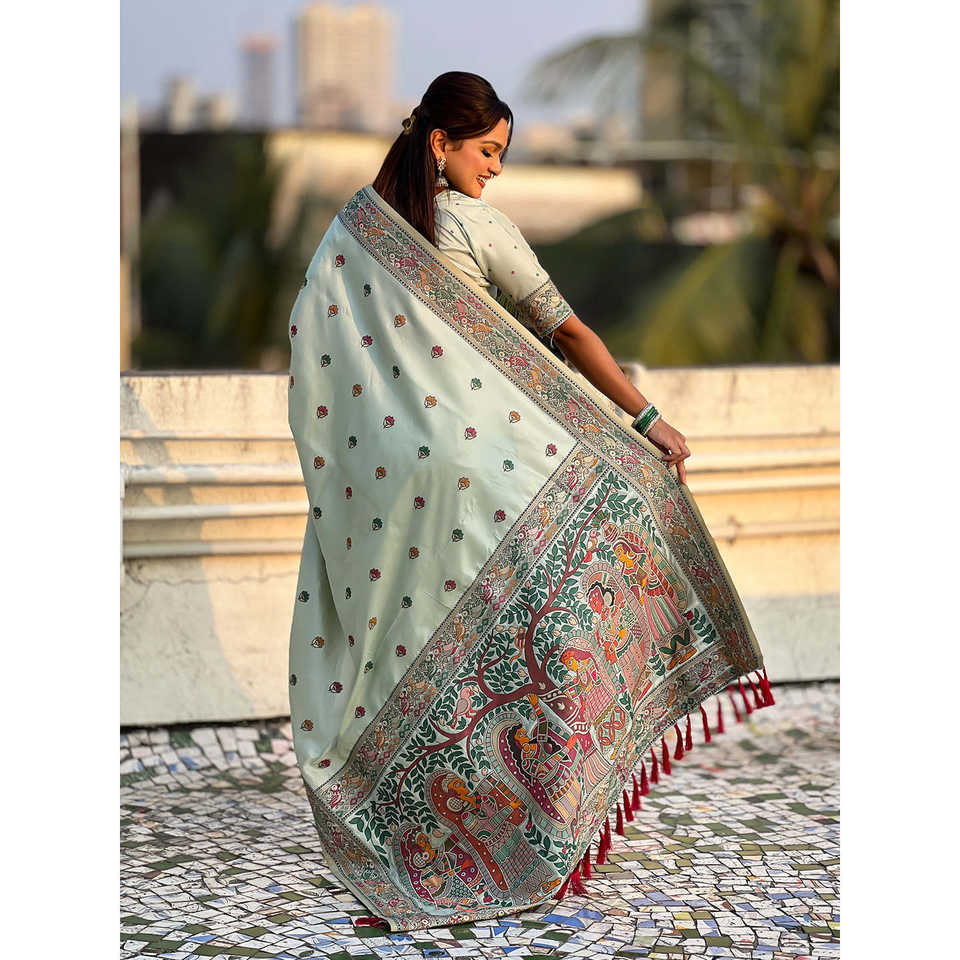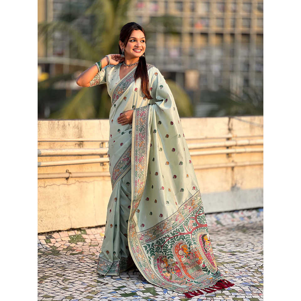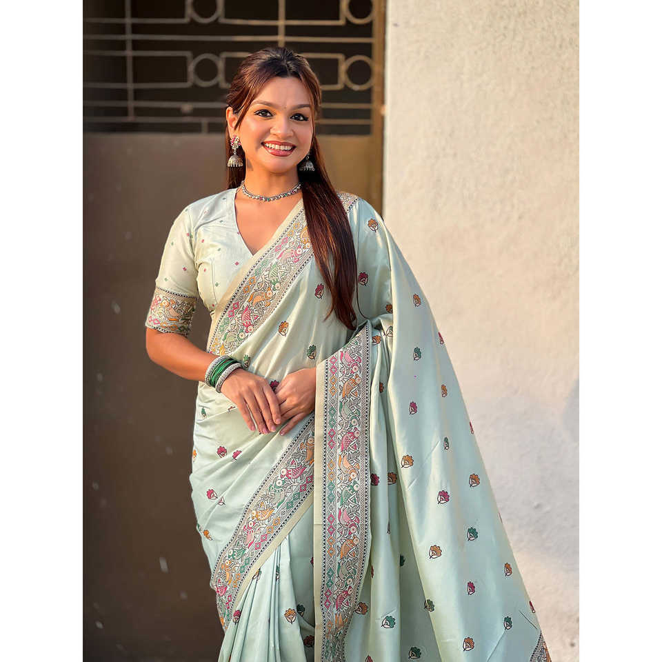 ผ้าไหมบาลูชารีสีฟ้าอ่อนลายทอซารีสำหรับงานกลางคืน น้ำหนัก 650 กรัม