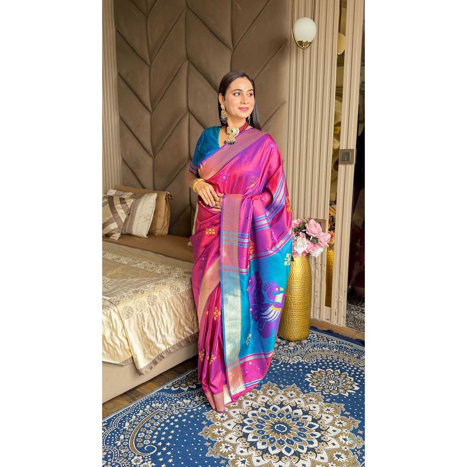 ผ้าไหมอิกกัตปาโตลาเนื้อนุ่มลายมีนาคารี ประดับด้วยลายขนนกยูงและขอบดิ้นทองคำ สำหรับงานแต่งงาน