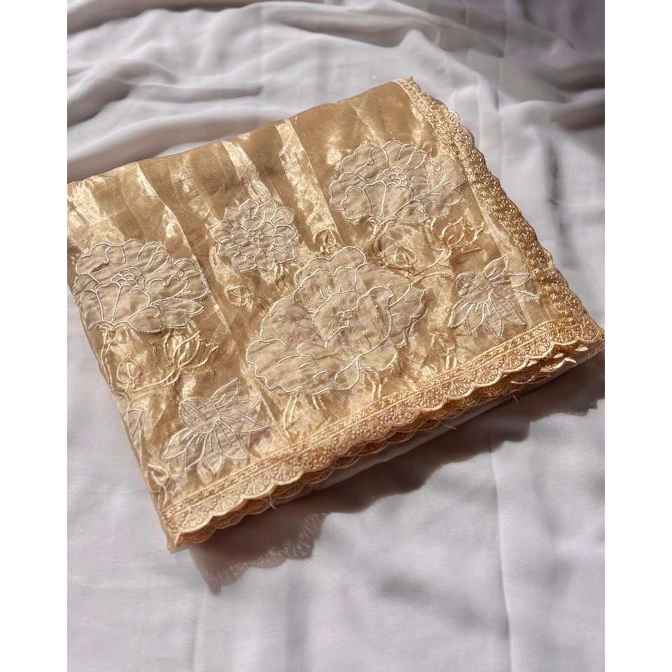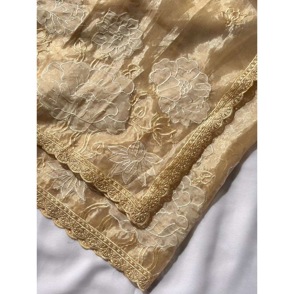 ผ้าไหมออริสสีเหลืองแท้ ดีไซน์เนอร์ซารี แบรนด์อีลิท วีฟส์ ประดับด้วยงานปัก น้ำหนัก 490 กรัม สำหรับงานแต่งงาน