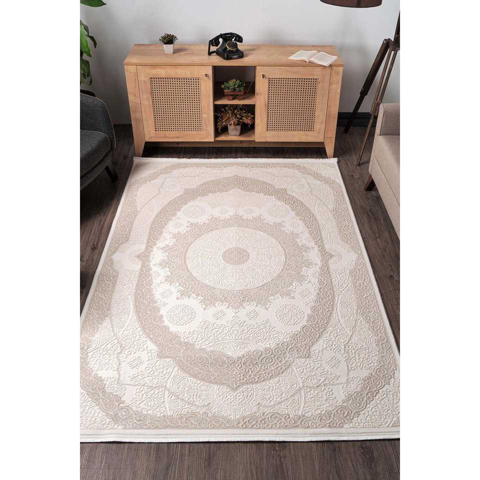 พรม Elkenz 7552 สีเบจ เนื้อนุ่ม ทนทาน ทอแบบแบนด้วยมือ ขนาด 80x150 ซม. รูปทรงสี่เหลี่ยมผืนผ้า เหมาะสำหรับห้องโถง ห้องนั่งเล่น และห้องนอน