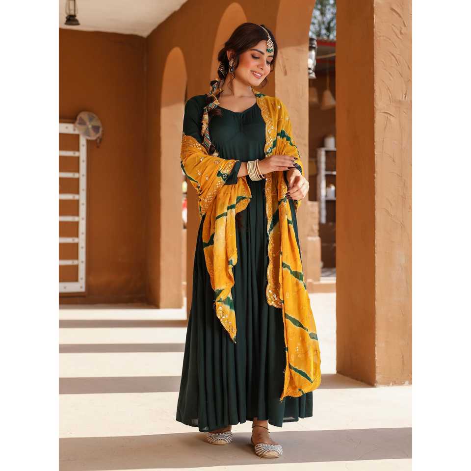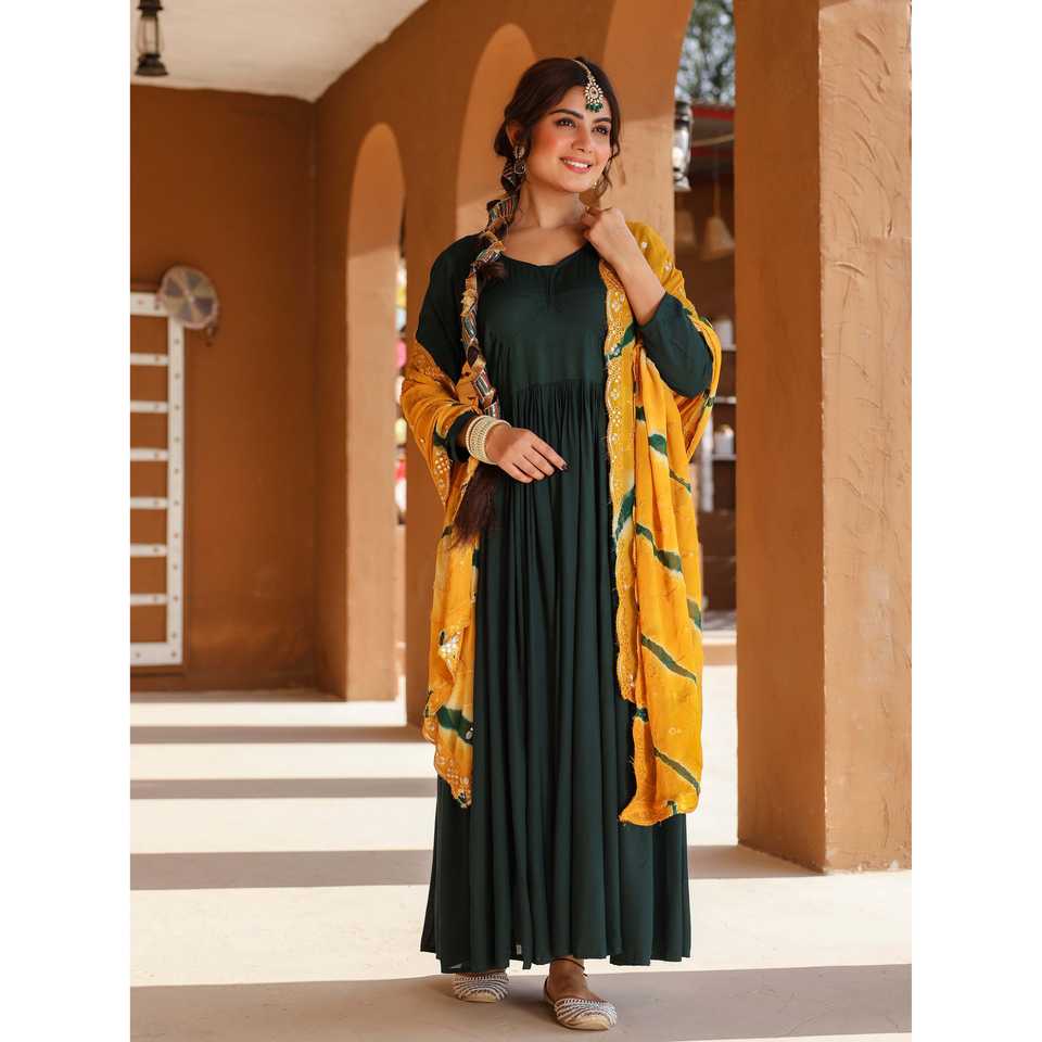 ชุดสูทผ้าชีฟองสีเขียวเอลลี่กรีน ไซส์ XS พร้อมผ้าคลุมไหล่สีเหลืองมัสตาร์ด