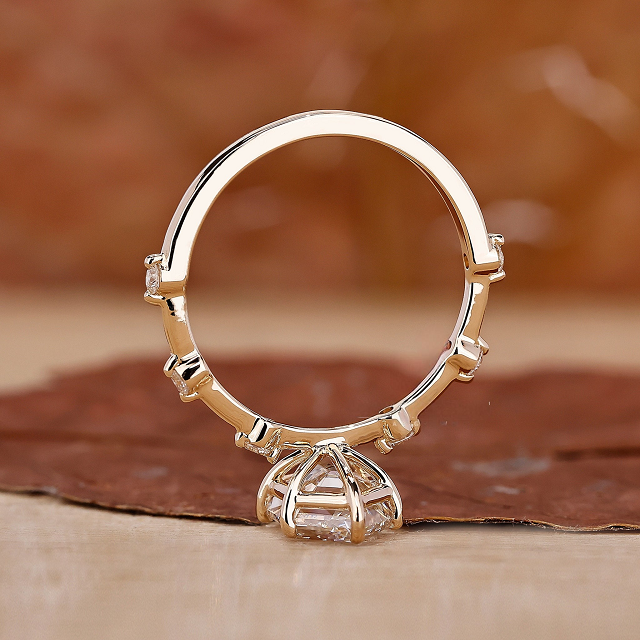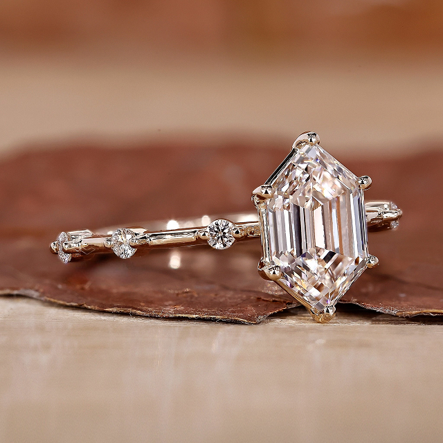 แหวนหมั้นเพชรทรงหกเหลี่ยมยาว รับรองโดย IGI เพชรเพาะเลี้ยงขนาด 1 ถึง 2 กะรัต ฝังแบบเดสทินซี แพฟ ยีโลว์โกลด์ ของขวัญสำหรับผู้หญิง