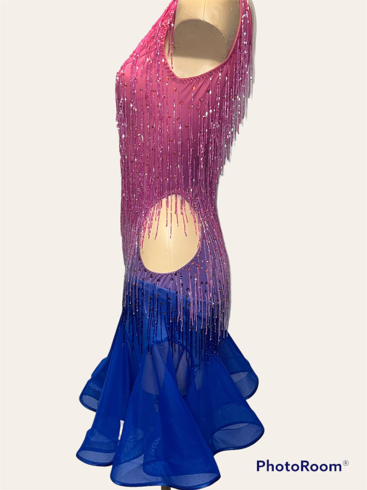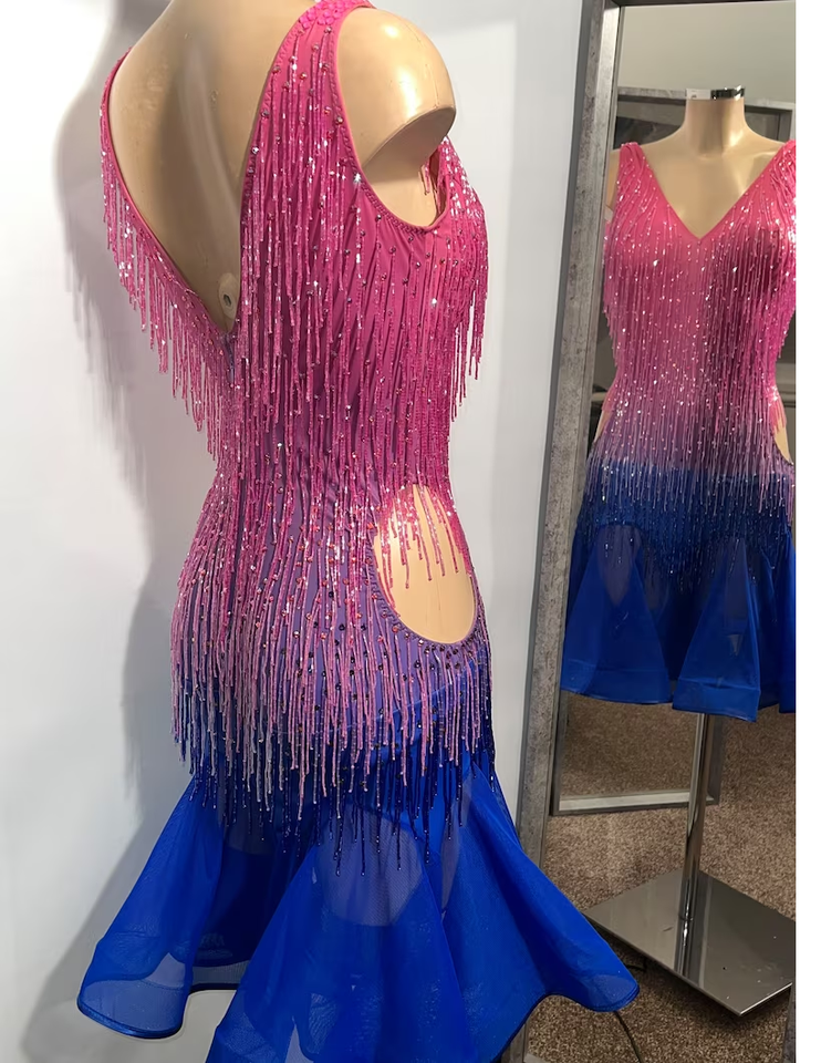 เดรสเต้นรำปักเลื่อมสีชมพูประดับด้วยลูกปัดยาวถึงเข่ายาวถึงเข่าทรงนางเงือกสุดเซ็กซี่ประดับด้วยลูกปัดประดับไข่มุกสำหรับงานปาร์ตี้