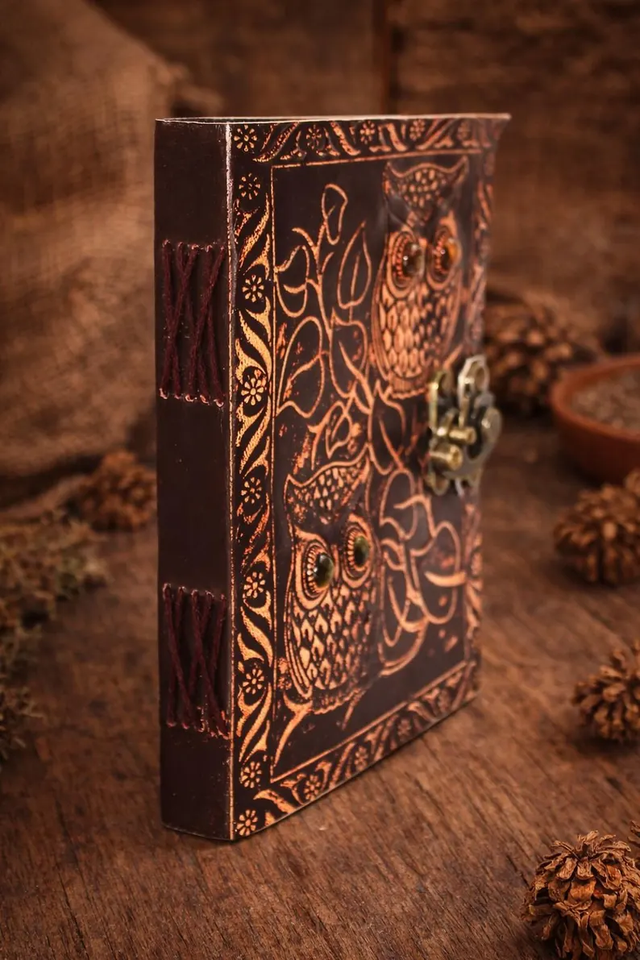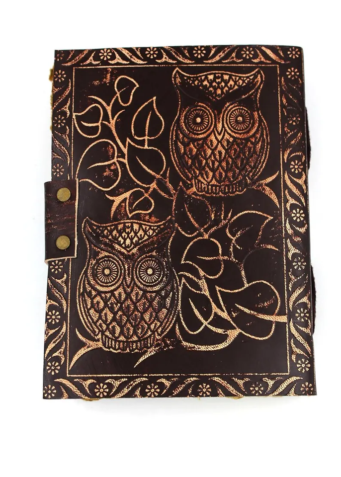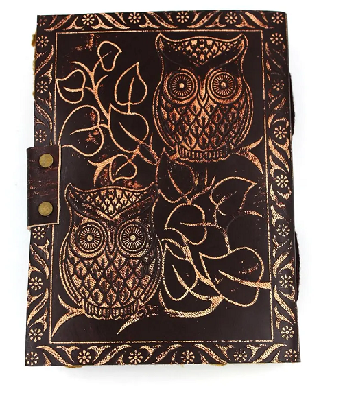 สมุดบันทึกหนังลายนกฮูกคู่แบบนูนทำมือมีขอบประดับสมุดบันทึกแบบเรียบง่ายแนววินเทจ