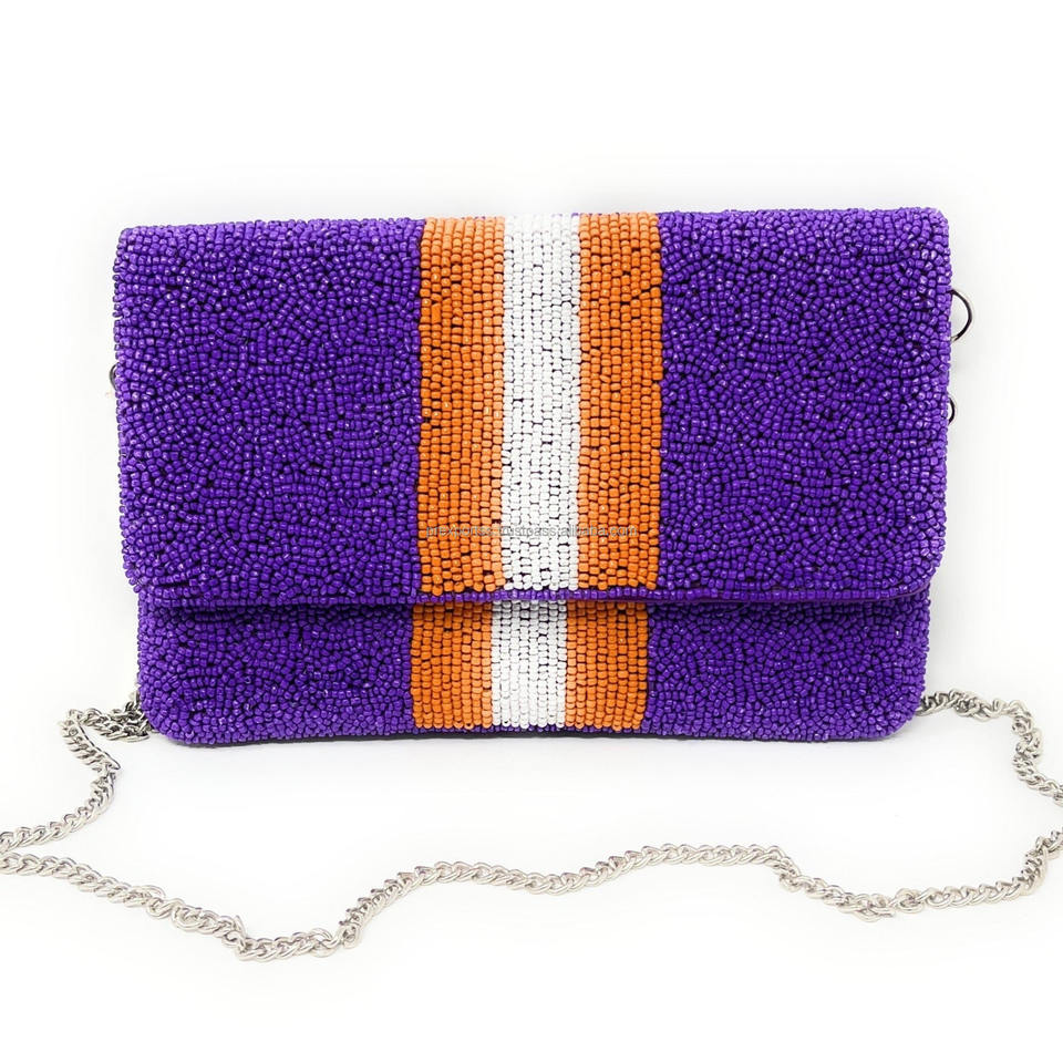 กระเป๋าคลัทช์ปักลูกปัดงานแฮนด์เมดกระเป๋าสะพายไหล่สายสะพายโซ่ลายทางสีส้มสีฟ้าสีขาว