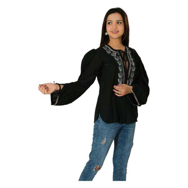 ท็อปส์ซูผ้าฝ้ายปักฤดูร้อนสวมใส่สบายๆเสื้อผู้หญิงทําด้วยมือเสื้อสีดําแขนยาวเสื้อ boho