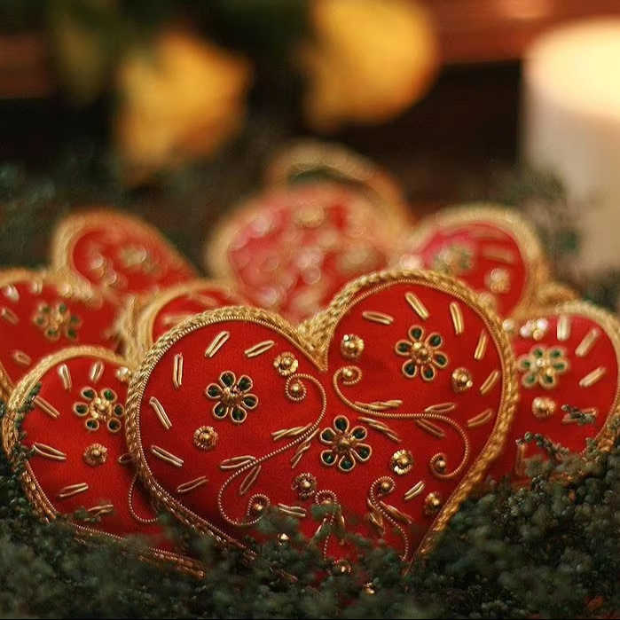 Embroidered Heart Christmas Ornaments Assorted Holiday Handmade Ornaments for Seasonal Display Red Velvet Hanging Decorations