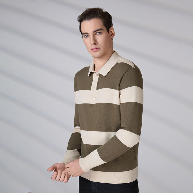 เสื้อโปโลผู้ชาย แขนยาว ลายปักโลโก้ ผ้าฝ้ายคุณภาพสูง แฟชั่นพรีเมียม ลายทางถัก