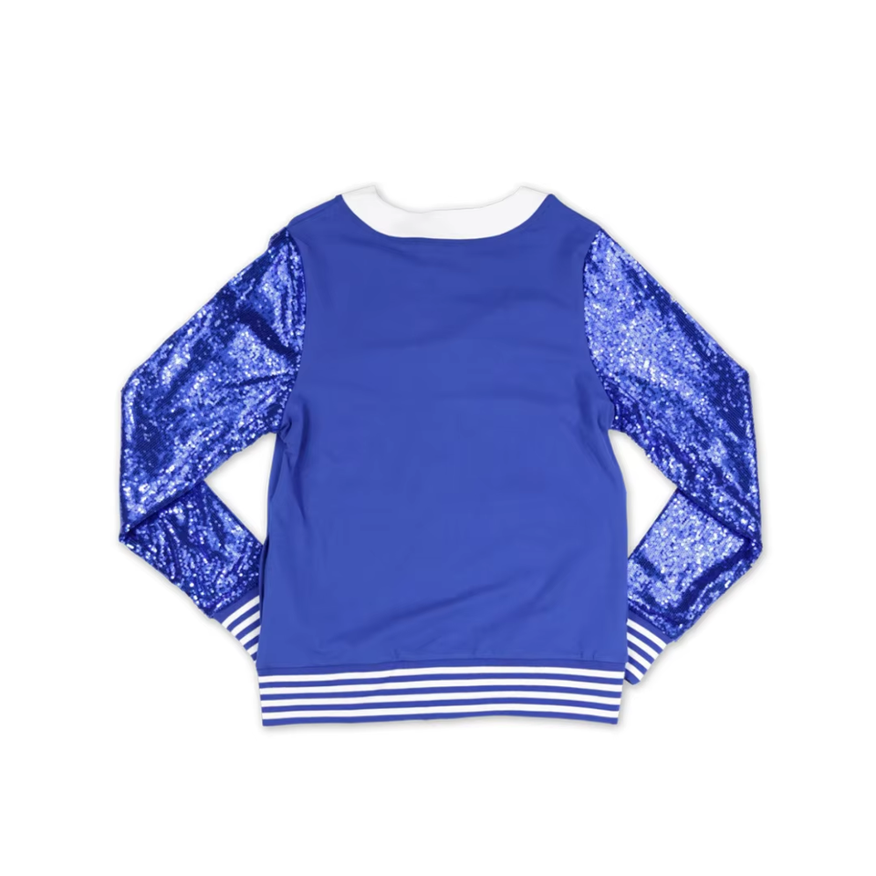เสื้อคาร์ดิแกนปักโลโก้สมาคมนักศึกษาหญิงแบบกรีก ชุดสั่งทำพิเศษ ซีต้า ฟี เบต้า สีน้ำเงินรอยัล แต่งเลื่อม ขอบสีขาว ตั้งแต่ปี 1920