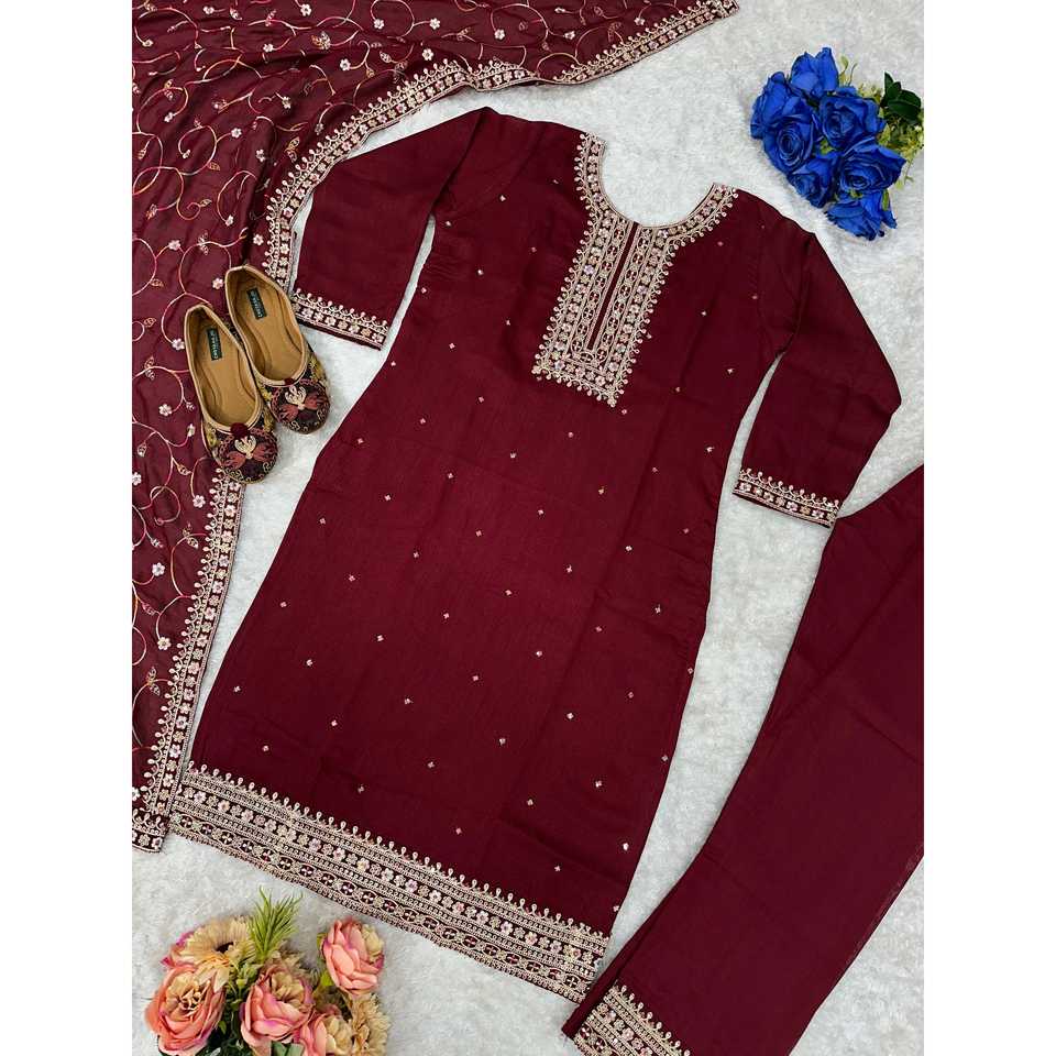 ชุดปาร์ตี้แบบเรียบร้อย ปักลาย ประกอบด้วยเสื้อ ท็อป แพลลาโซ และผ้าคลุมไหล่