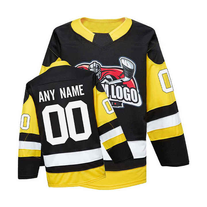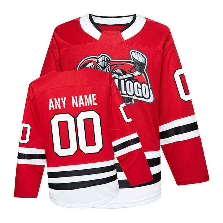 ชุดแข่งฮอกกี้น้ำแข็งปักลายสำหรับลีกมืออาชีพผ้าทอลายทแยงตัดและเย็บตะเข็บเสื้อเจอร์ซี่สำหรับทีมออกแบบโลโก้ได้ตามต้องการ