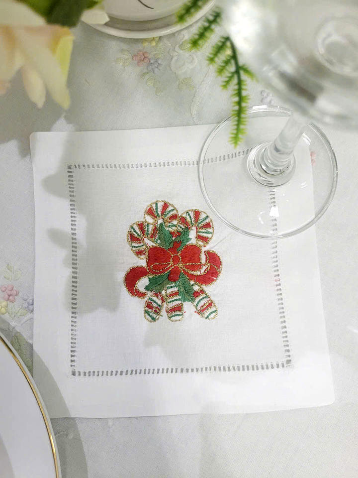 ผ้าเช็ดปากปักลายก้านลูกกวาดสีแดง ขนาด 6x6 นิ้ว ผ้าฝ้ายสีขาว ขอบเย็บแบบเฮมสติช สำหรับใช้ในบ้านหรือโรงแรมในช่วงเทศกาล