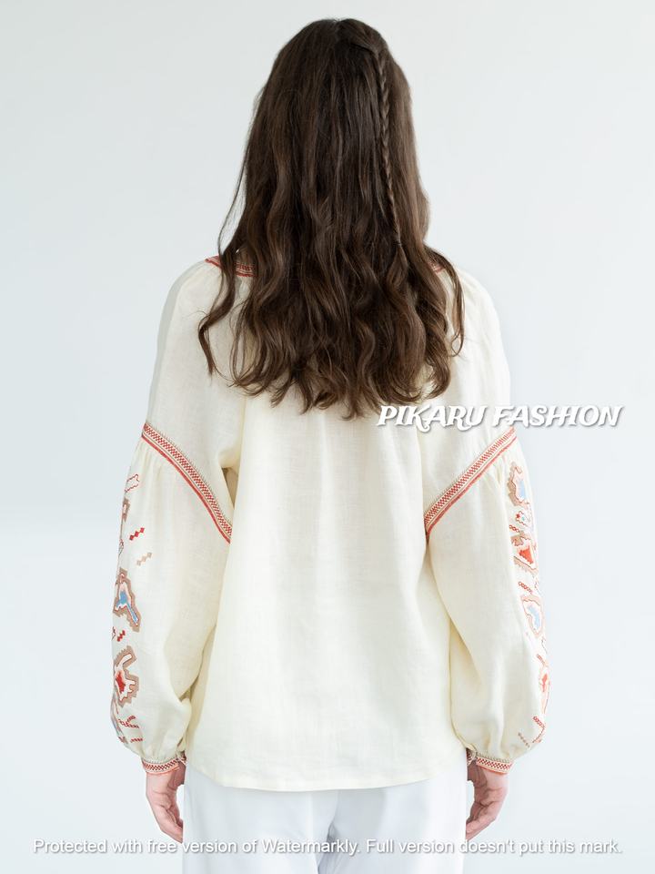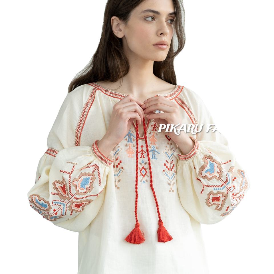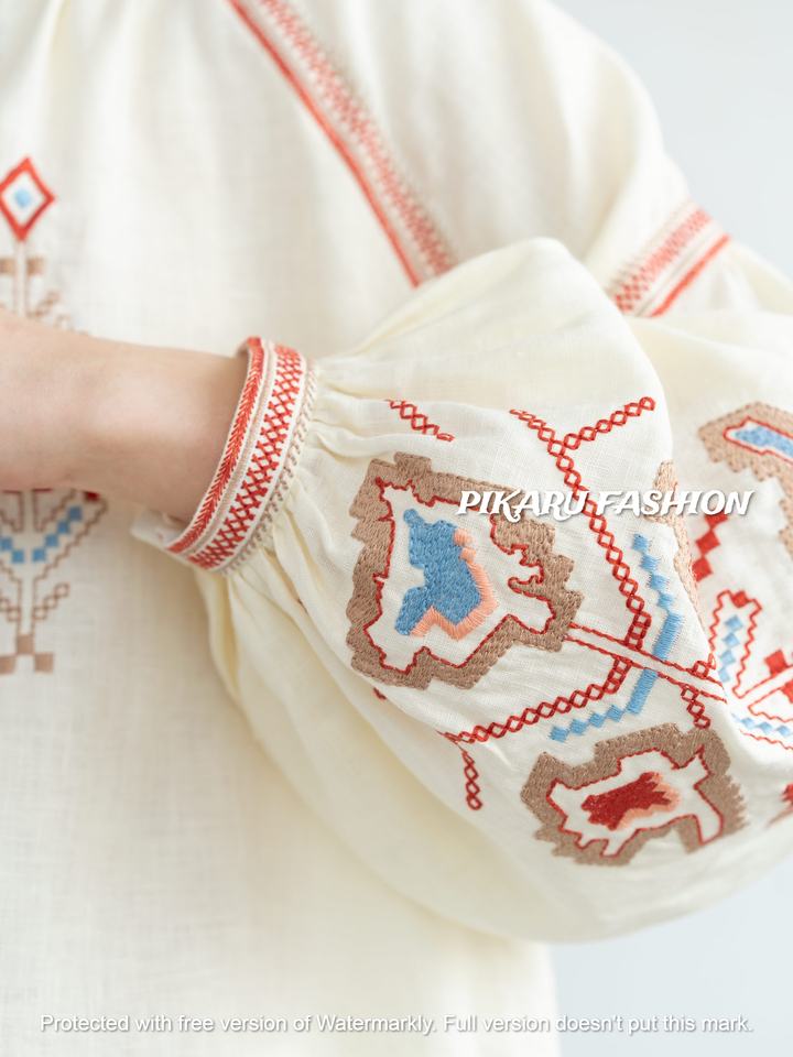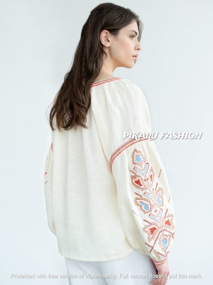 เสื้อท่อนบนแฟชั่นฤดูร้อนสำหรับผู้หญิง คอวี แขนยาว ปักลาย งานปักคุณภาพสูง เอวสูง ผ้าลินินแท้ 100% สวมใส่ได้ทั้งแบบลำลองและเป็นทางการ