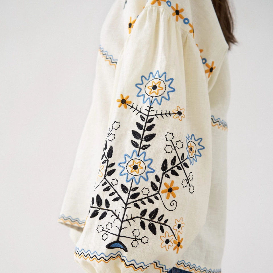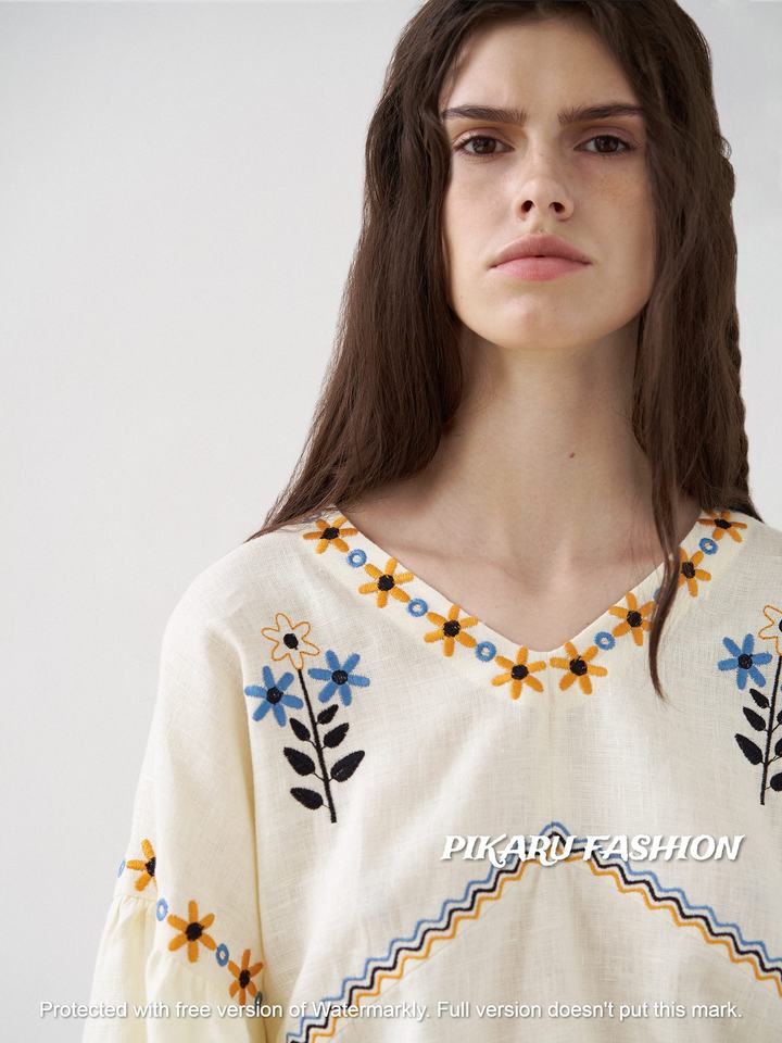 เสื้อเบลาส์คอวีแขนพองปักลาย,เสื้อแฟชั่นทันสมัยดีไซน์เนอร์แขนพอง