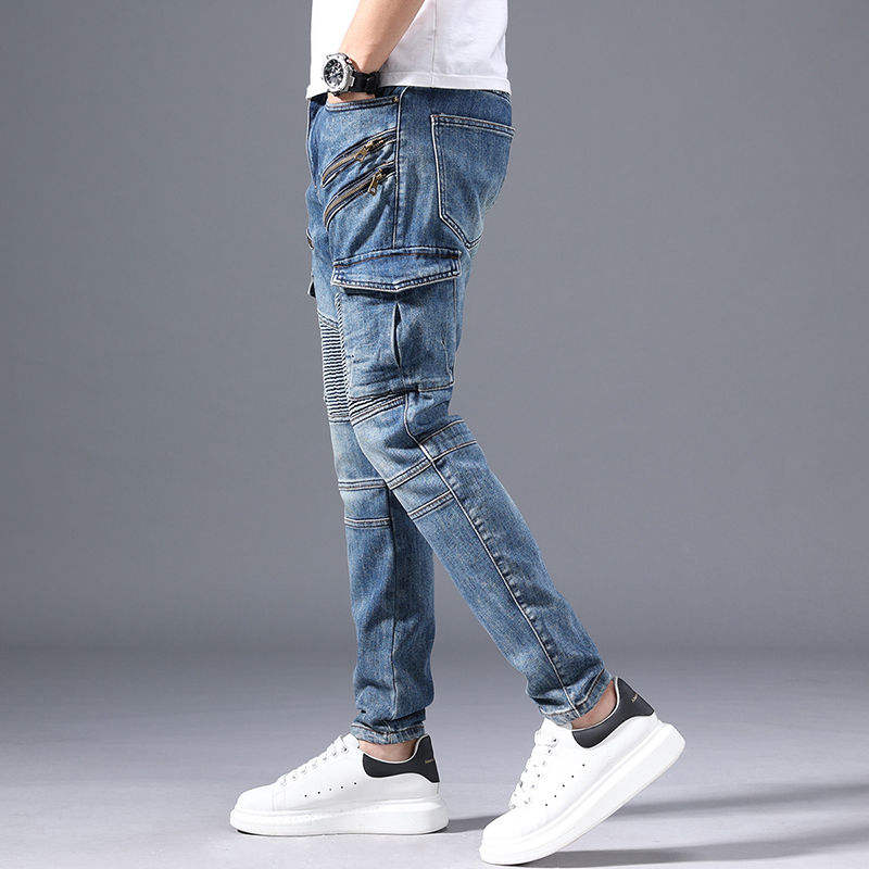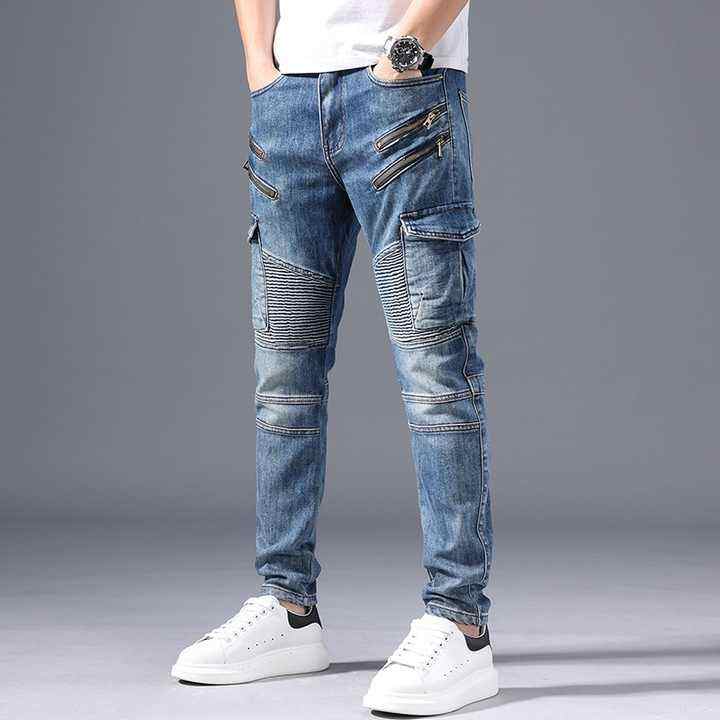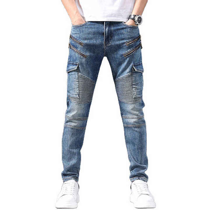 กางเกงยีนส์ผ้าเดนิมเข้ารูปสำหรับผู้ชายทรงเข้ารูปปักลายสีน้ำเงิน