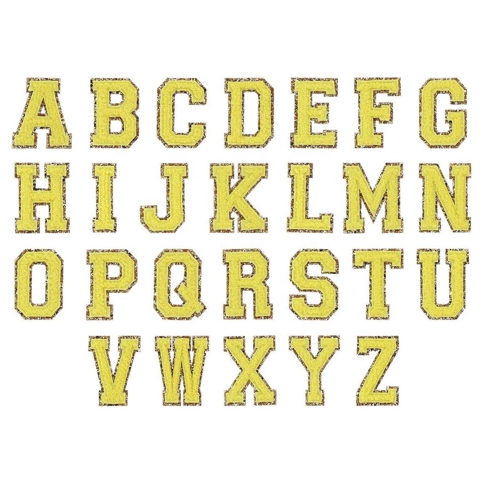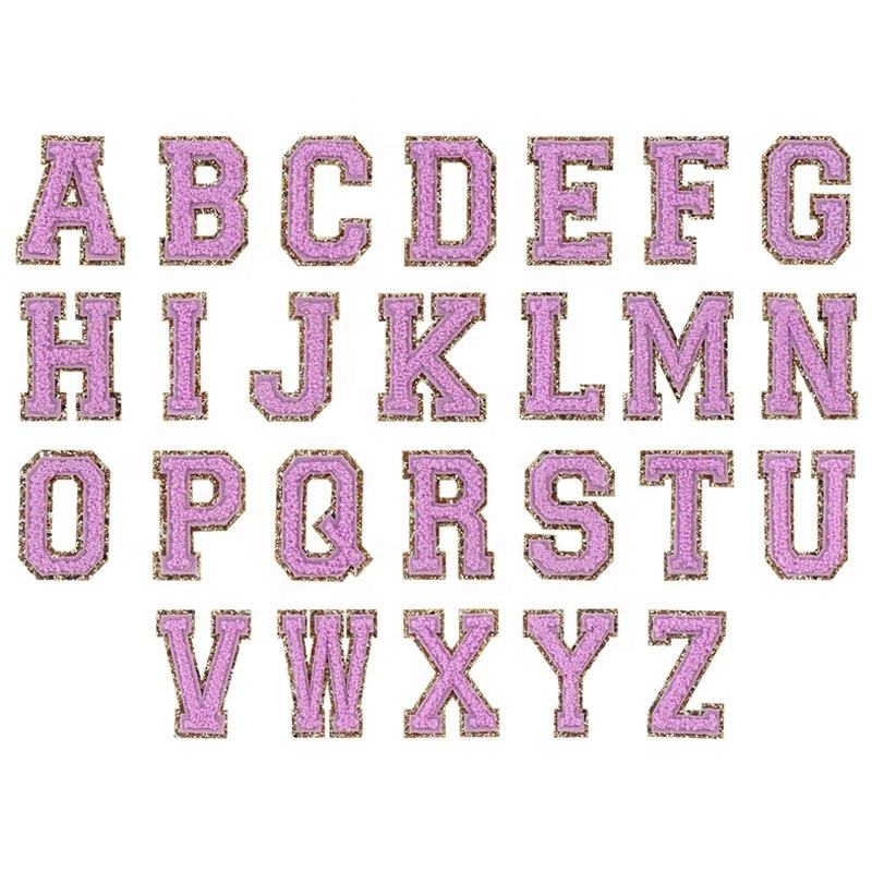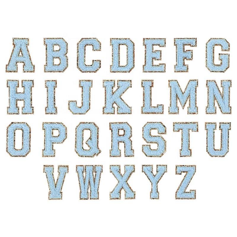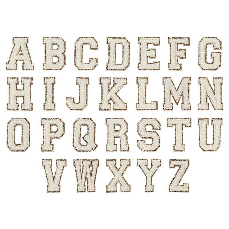 ป้ายปักสำหรับชุดกีฬา ชมรม ปักด้วยไหมเชนิลสีขาว ตัวอักษรกลิตเตอร์สีทอง ป้ายติดเสื้อผ้าผู้ชาย ผู้หญิง ลายตัวอักษร ลายดอกไม้ เป็นมิตรกับสิ่งแวดล้อม