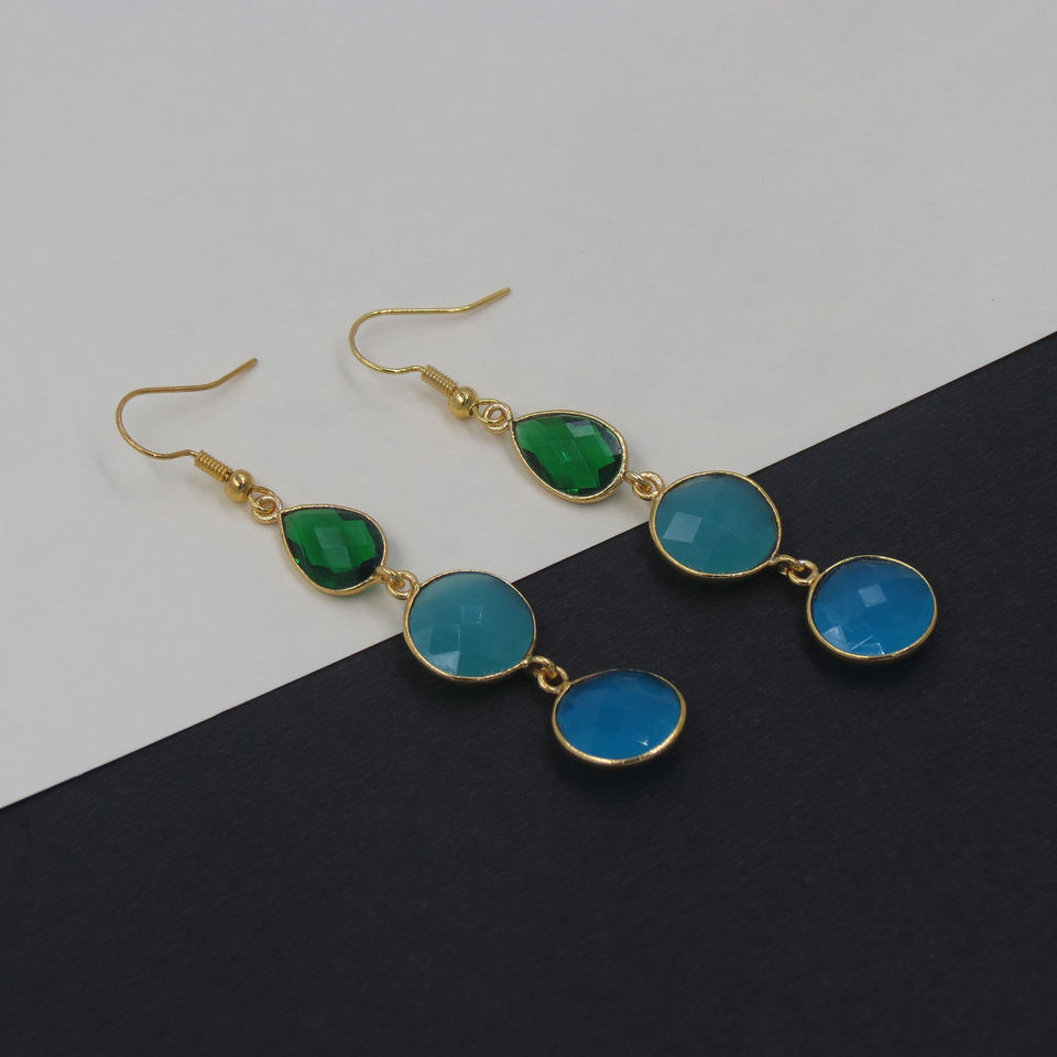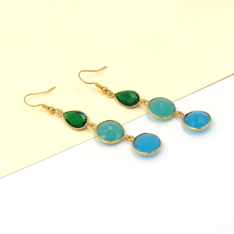ต่างหูห้อยประดับพลอยหลากสีสัน ลายดอกไม้สไตล์โบฮีเมียน สีเขียวมรกต สีฟ้าอมเขียว และสีแคลซิโดนี สำหรับงานแต่งงาน | กรอบตัวเรือนทำมือ ชุบทอง 18K