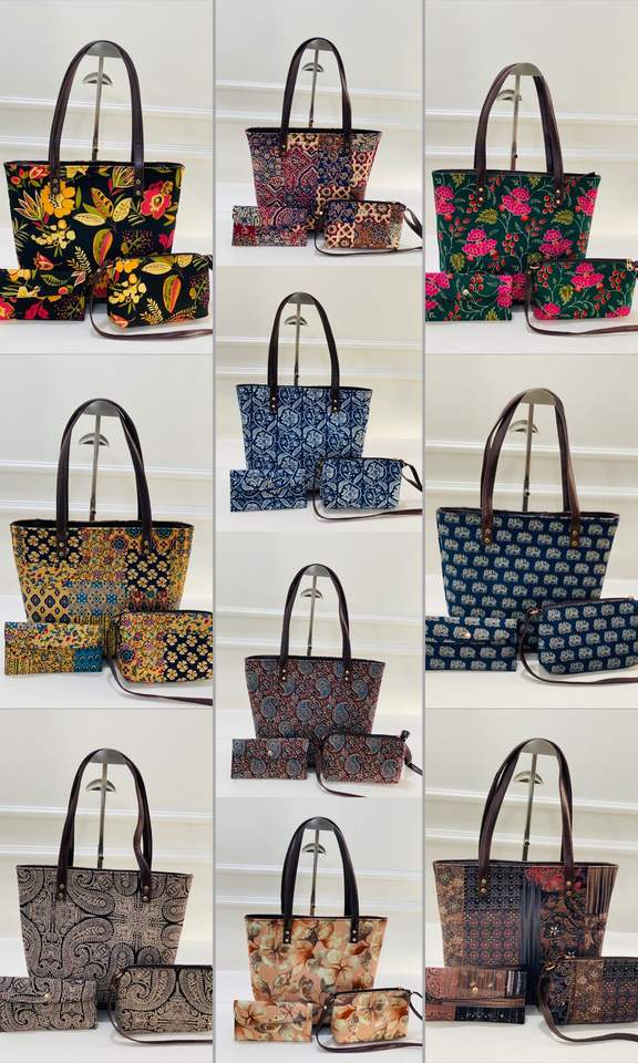 ผ้าพิมพ์ลาย พร้อมหูหิ้วและขอบตกแต่งหนัง PU