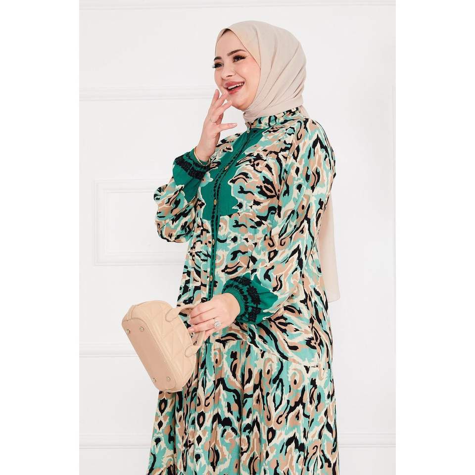 ชุดเดรสฮิญาบแบบเรียบมีลายกระดุมสีมรกต