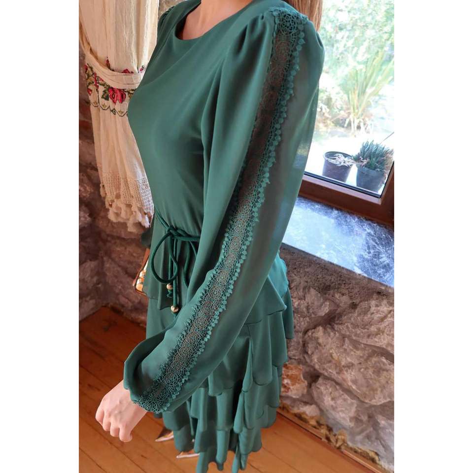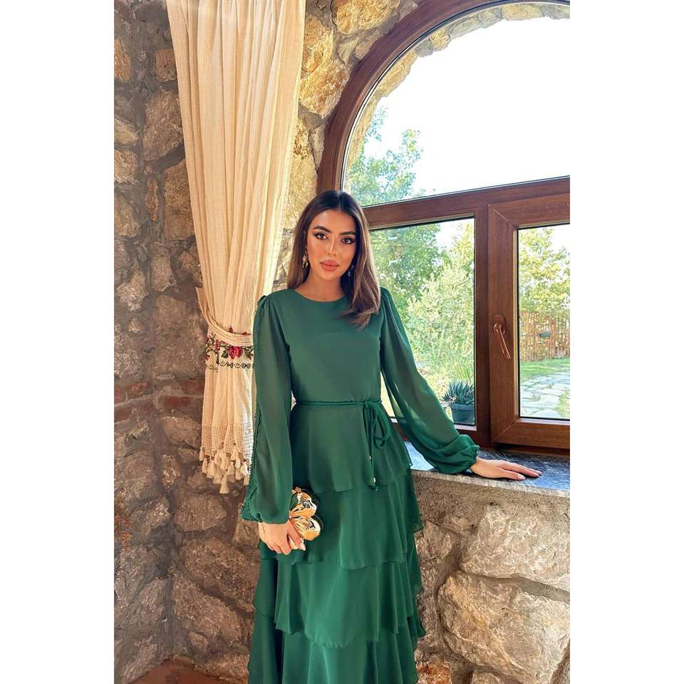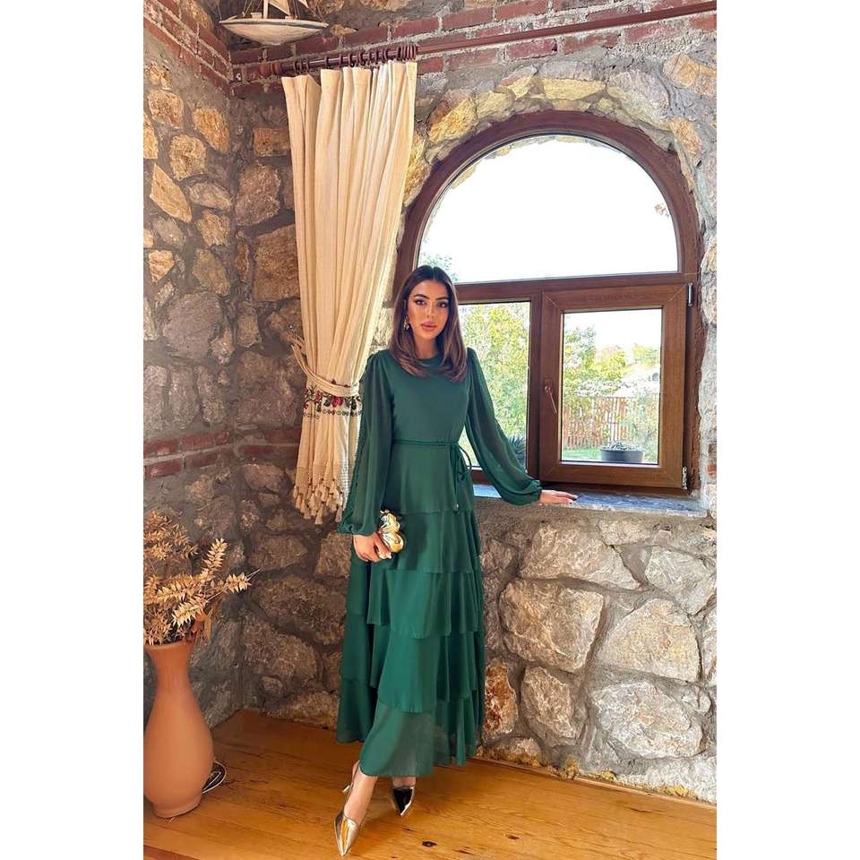ชุดเดรสชีฟองสีมรกตทรงเอไลน์เอวธรรมชาติผ้าบางระบายเป็นชั้นๆ ชุดราตรี