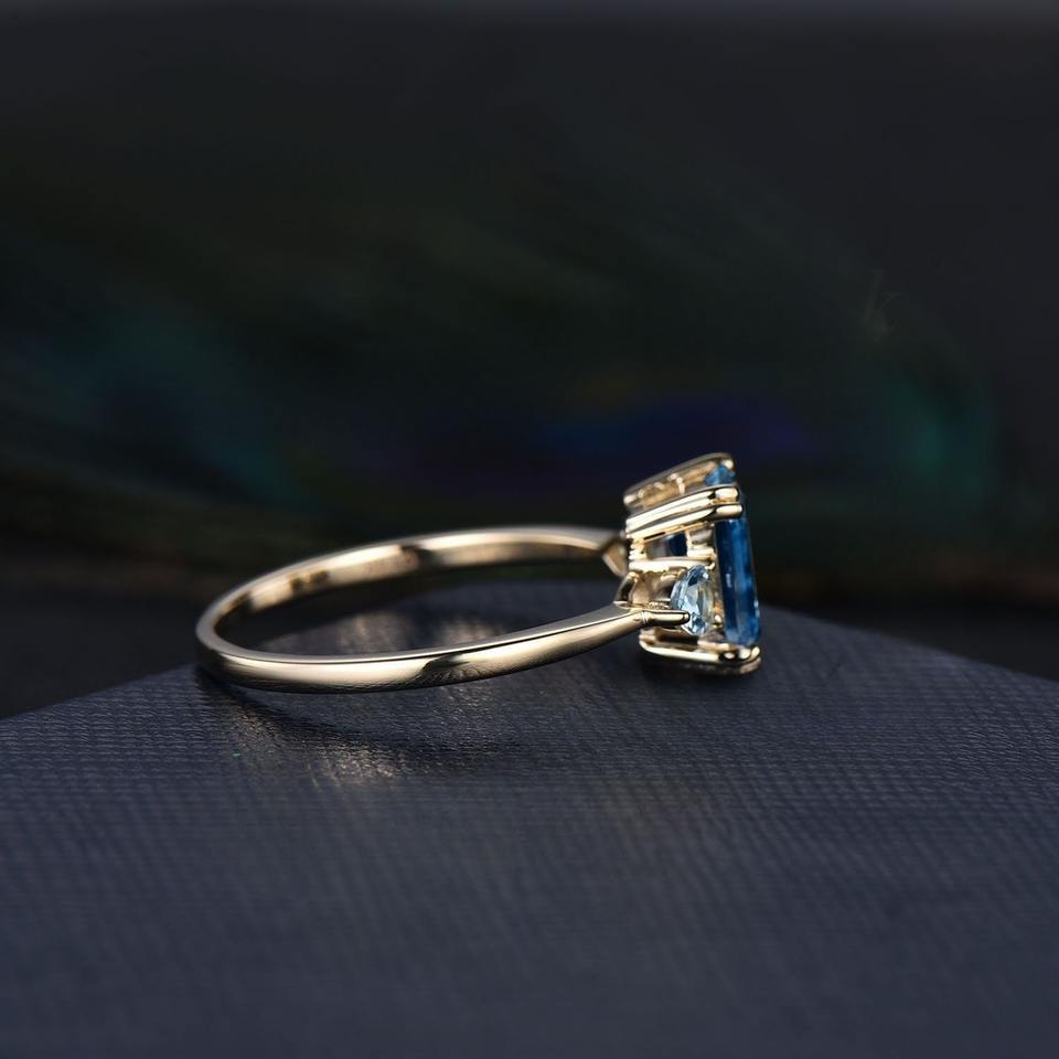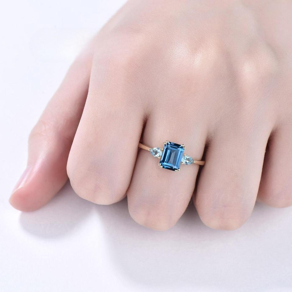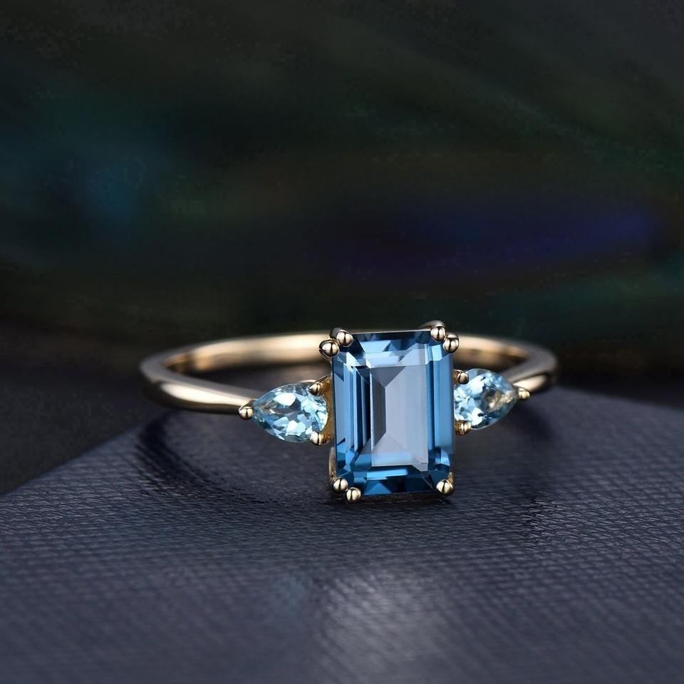 แหวนทองคำประดับบลูโทแพซทรงเอเมอรัลด์คัทและโทแพซทรงหยดน้ำ 3 เม็ด แหวนแต่งงานแบบ 8 กรงเล็บ แหวนประจำเดือนธันวาคม ผลิตเครื่องประดับโดยผู้ผลิตในอินเดีย