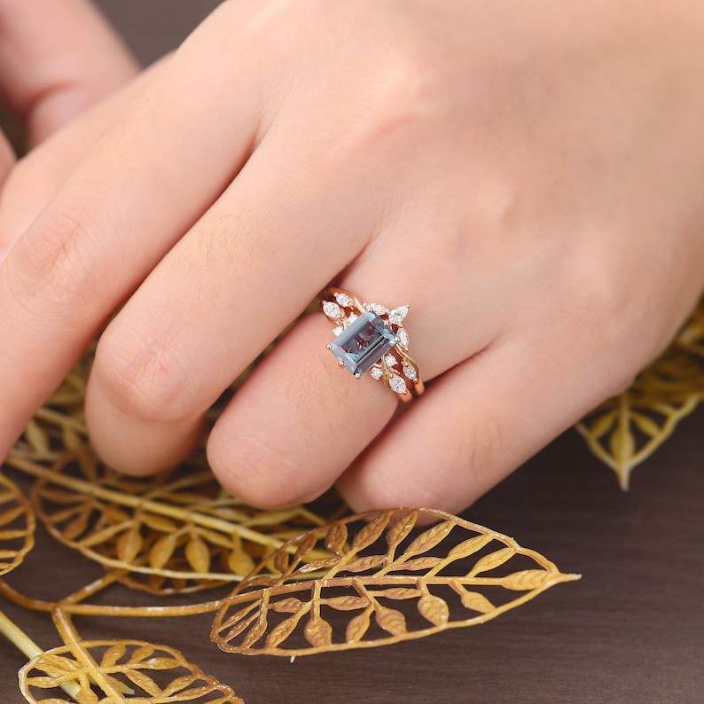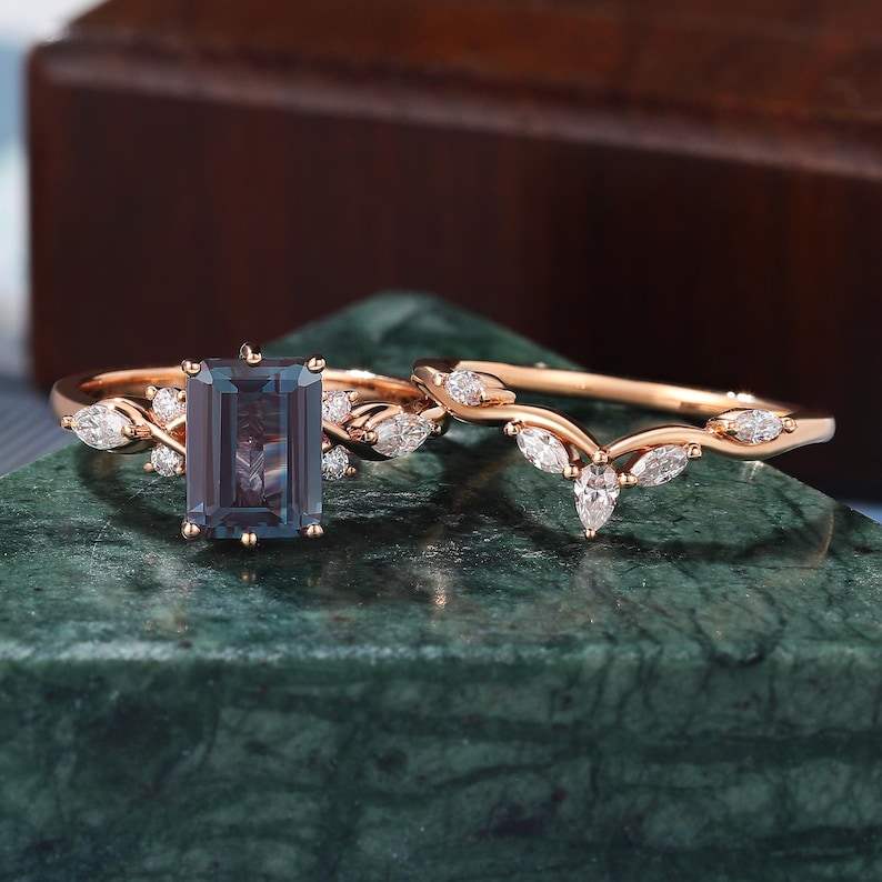 แหวนหมั้นทรงเอเมอรัลด์คัทประดับอเล็กซานไดรต์สังเคราะห์ ชุดแหวนแต่งงานวินเทจโรสโกลด์ประดับมอสซาไนต์