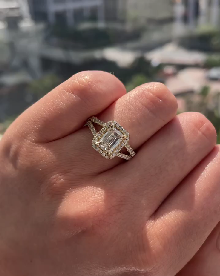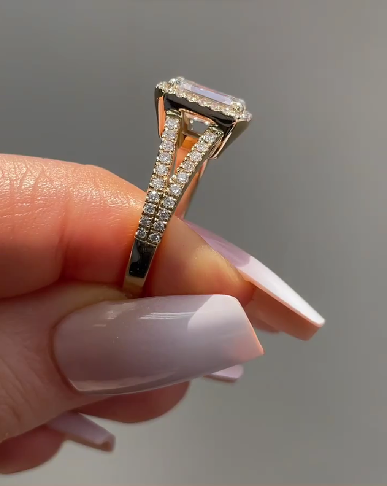 มรกตตัดLabปลูกแหวนเพชรHalo CVDแหวนแต่งงานเพชร2.20 CtwมรกตตัดPaveชุดLabสร้างแหวนหมั้นVS1