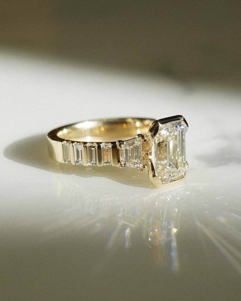 แหวนเพชรทรงเอเมอรัลด์คัท 2.5 กะรัต แบบฝังเรียงวงแหวนหนา ทองคำขาว 14K สำหรับงานหมั้นและงานแต่งงาน จากโรงงานผลิตเครื่องประดับ