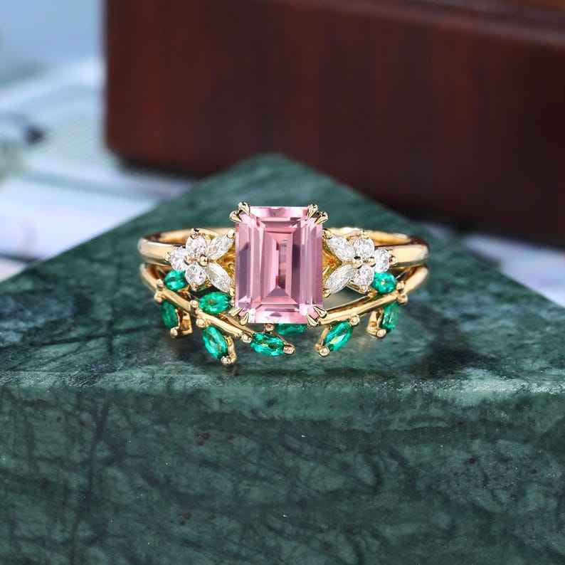 แหวนแต่งงานประดับไพลินสีชมพูทรงเอเมอรัลด์คัท ชุดแหวนทองคำขาวสำหรับเจ้าสาว เครื่องประดับหมั้น