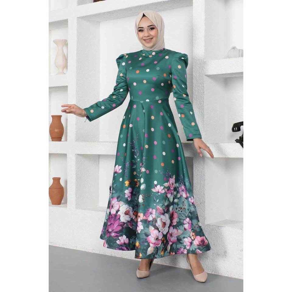 Emerald Floral Polka Dot Satin A-Line Maxi Dress Modern Party Ball Gown 100% Polyester Evening Parties MSW12251-3 Natural