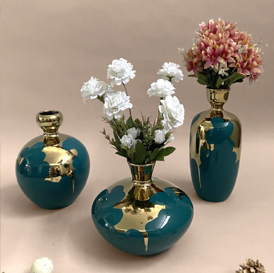 แจกันดอกไม้เซรามิกสีทองมรกตดีไซน์ร่วมสมัยเครื่องลายครามทันสมัยตกแต่งบ้านสำหรับสำนักงานหรือโรงแรม