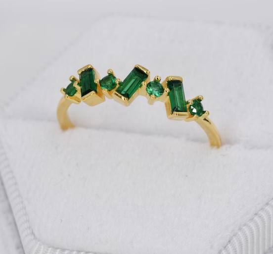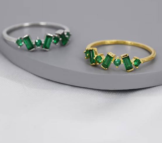 แหวนเงินแท้ประดับเพชร CZ ทรงบาแกตต์สีเขียวมรกต รูปทรงออร์แกนิก ชุบเงินหรือชุบทอง