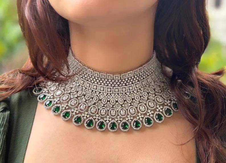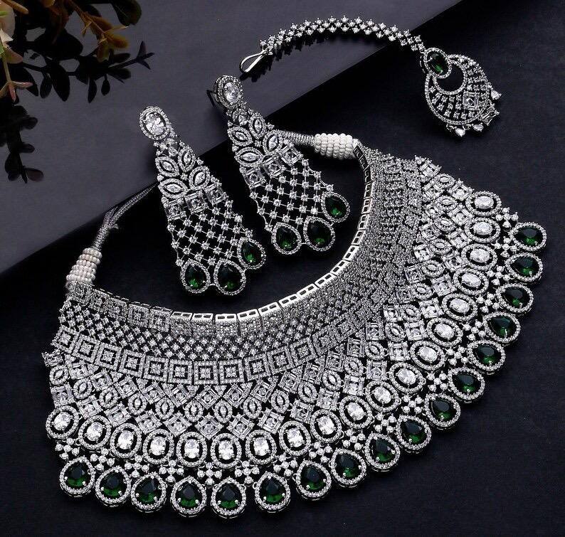 ชุดสร้อยคอเจ้าสาวสีเขียวมรกตทองเหลืองประดับมงกุฎเพชรซิร์คอน ชุดเครื่องประดับงานแต่งงานแบบปากีสถาน นิกาห์ อินเดีย บอลลีวูด พร้อมมงกุฎมังติกา