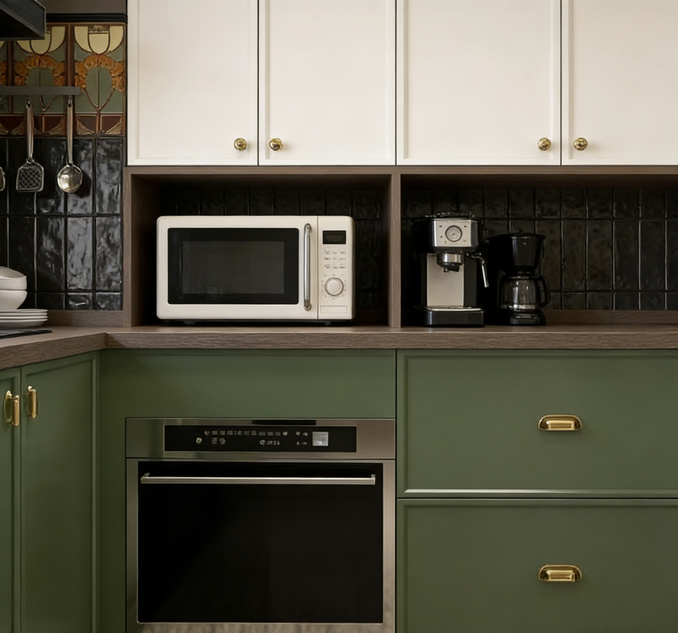 ทำด้วยไม้, เป็นมิตรกับสิ่งแวดล้อม, ทนไฟ, ครัวสมัยใหม่, ตู้ครัวแบบแยกส่วน