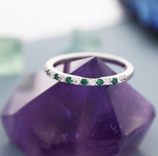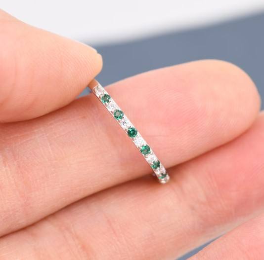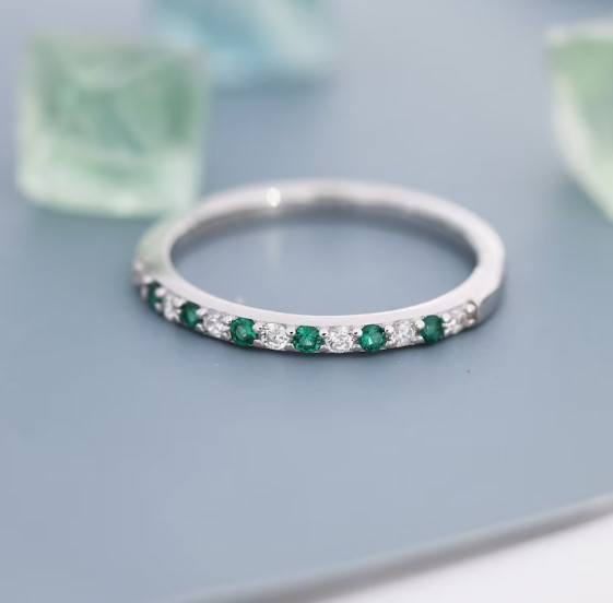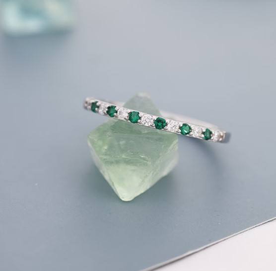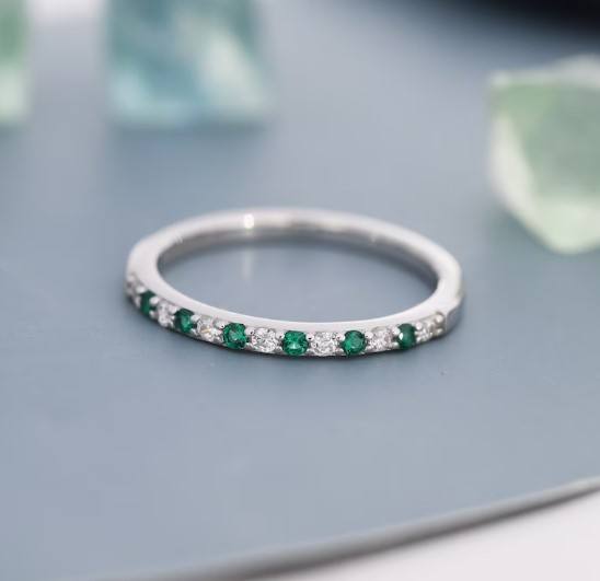 แหวนครึ่งวงนิรันดร์ประดับมรกตสีเขียวและเพชร CZ ใส บนตัวเรือนเงินสเตอร์ลิง หรือแหวนเงินหรือทองประดับมรกตสีเขียวเพชร CZ แบบเรียวบางสำหรับซ้อนกัน