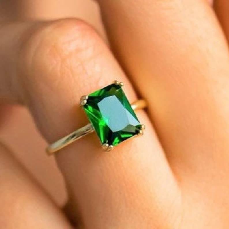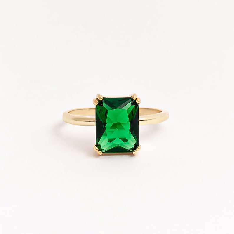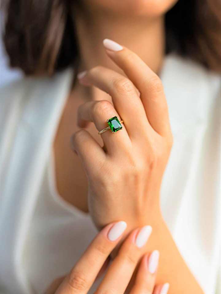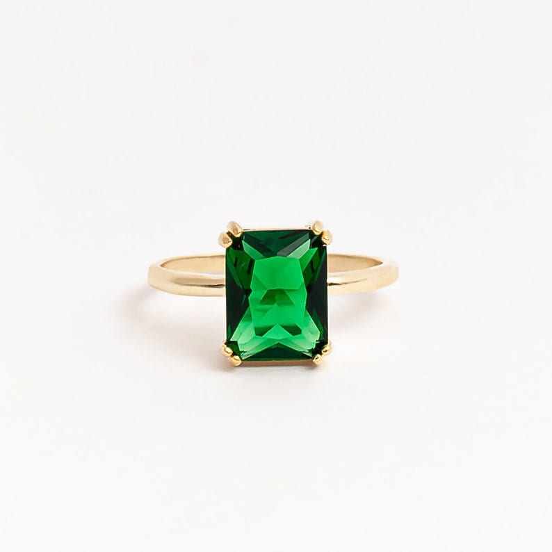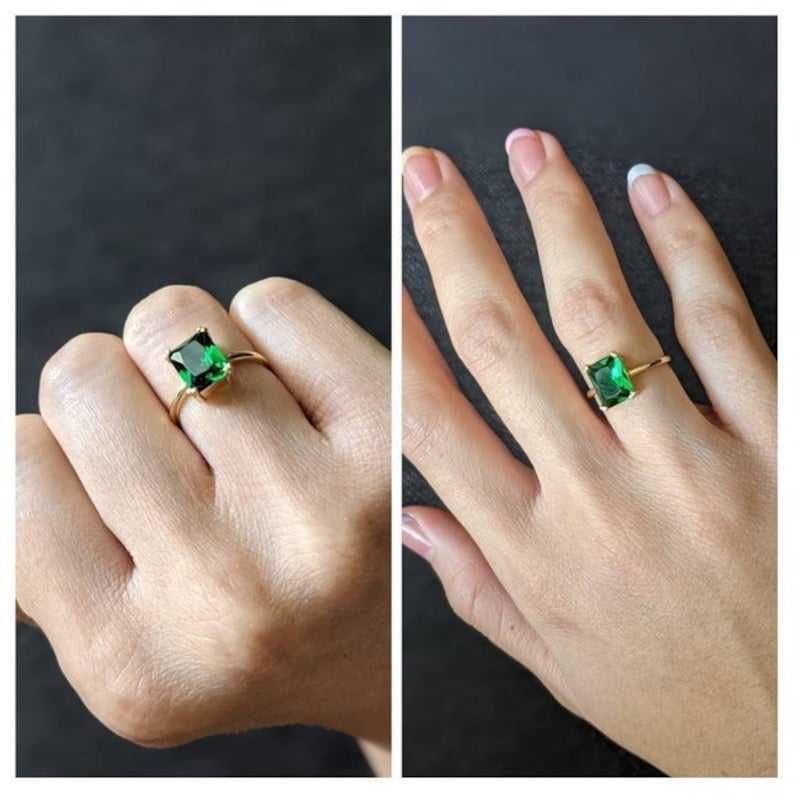 แหวนมรกตประจำเดือนพฤษภาคม เงินแท้ 925 ชุบทอง 14K มรกตทรงเหลี่ยมเดี่ยวสีเขียว แหวนมรกตสุดหรูสำหรับผู้หญิง