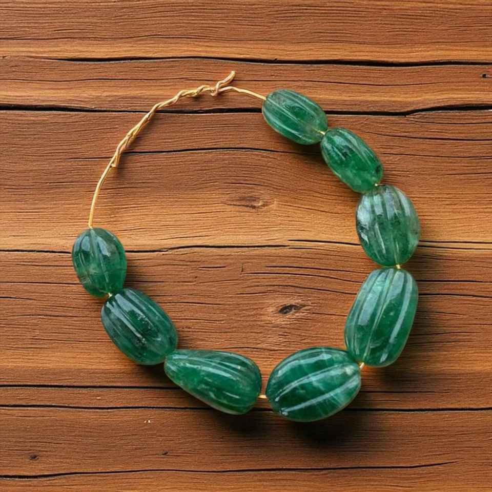 สร้อยคอและกำไลข้อมือประดับลูกปัดมรกตทรงรีรูปเมลอน ดีไซน์แฮนด์เมดประดับด้วยพลอยสีเขียวธรรมชาติ คัดพลอยเม็ดเดี่ยว ตามเทรนด์ปี 2026