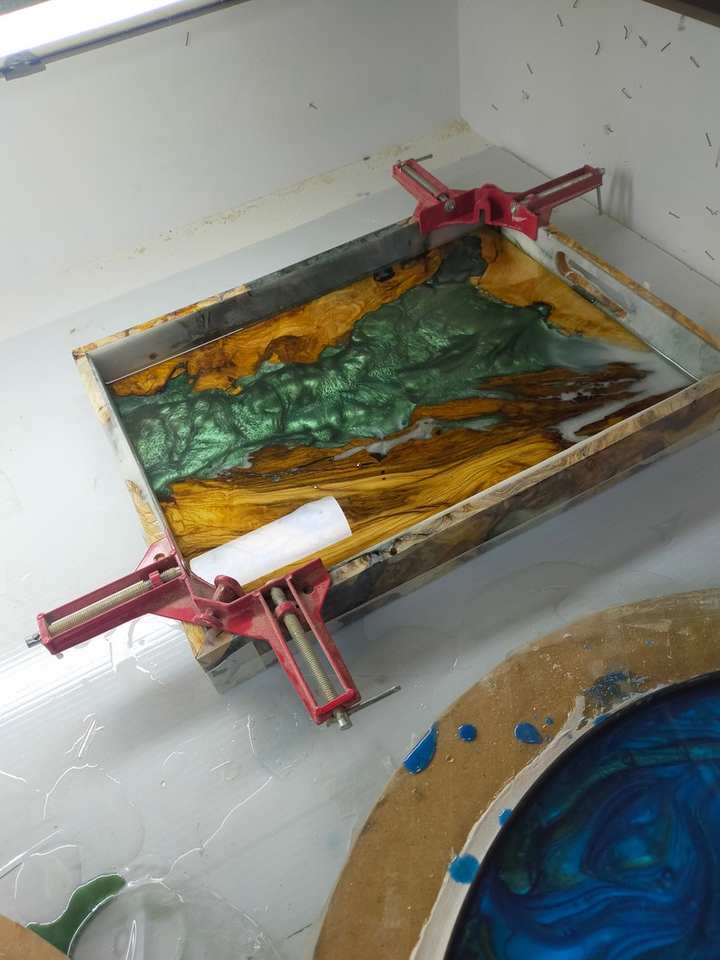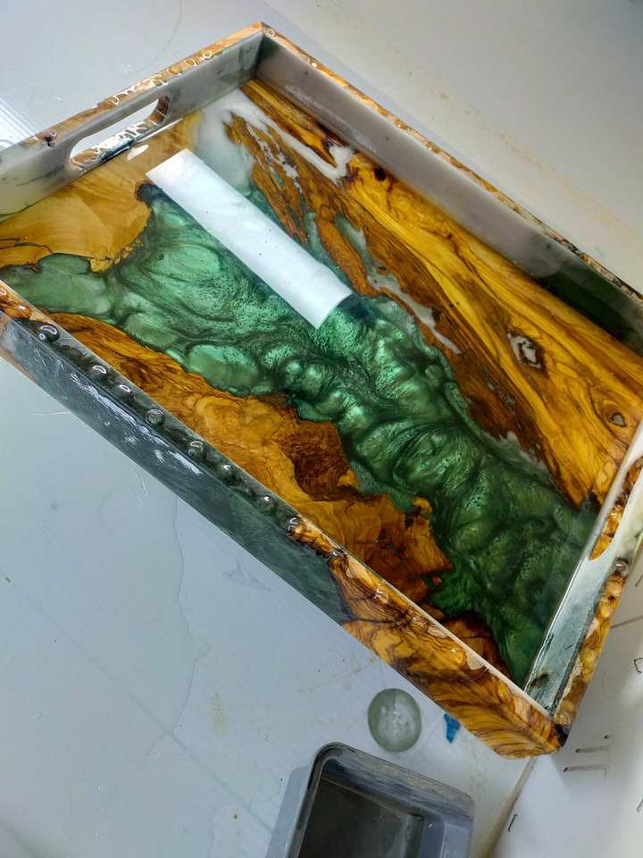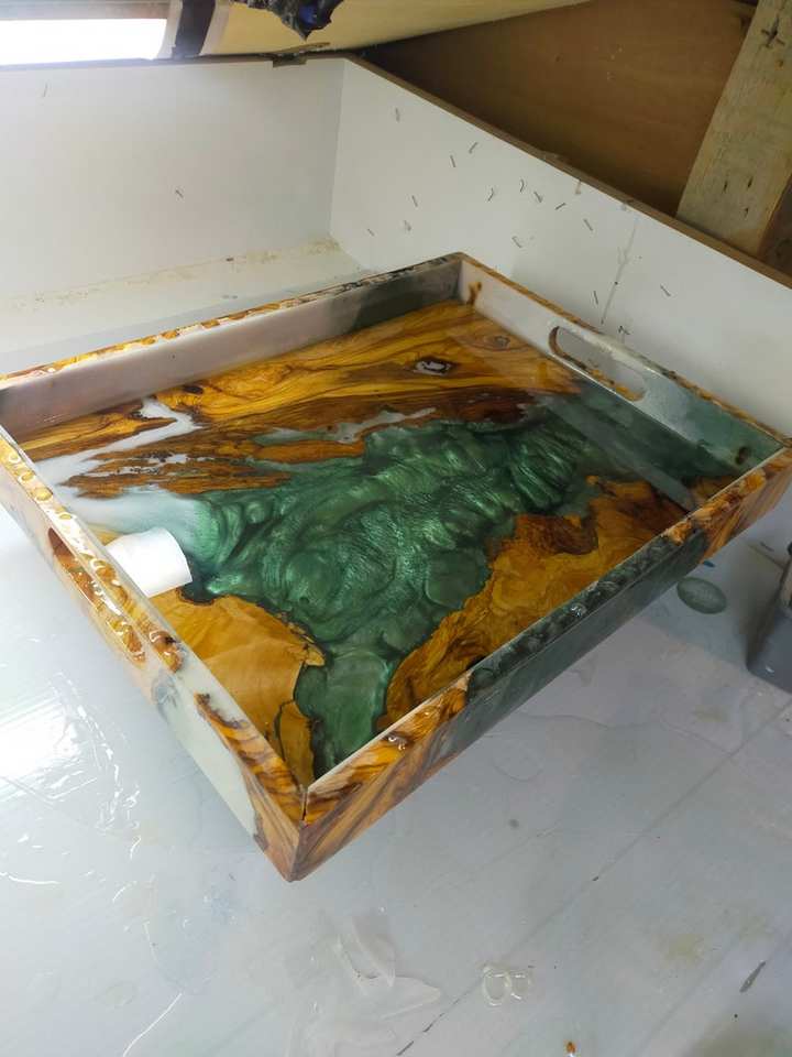 ถาดเสิร์ฟไม้เคลือบอีพ็อกซี่ลายแม่น้ำมรกต งานแฮนด์เมด ขอบไม้ธรรมชาติ ถาดตกแต่งโต๊ะกาแฟ