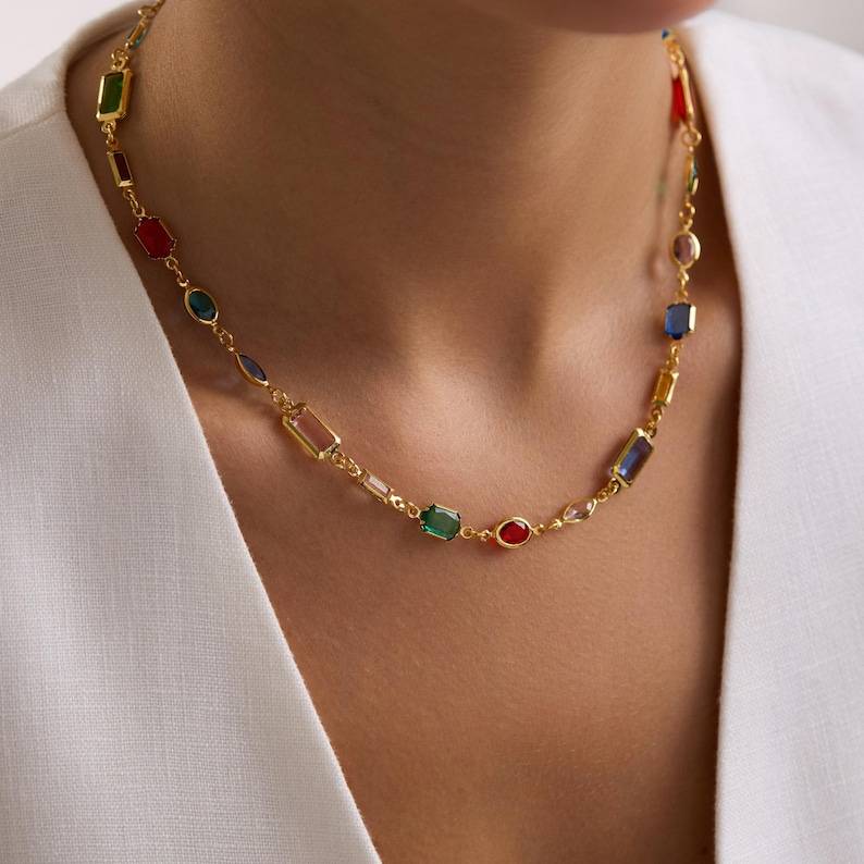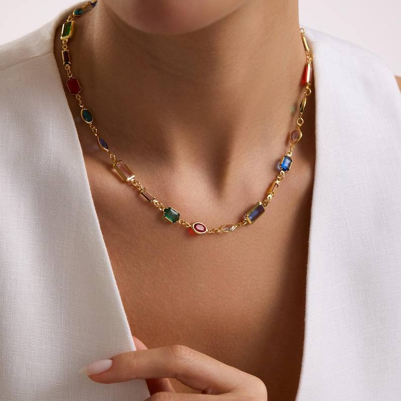 สร้อยคอประดับพลอยหลากสี มรกต ทับทิม ไพลิน เงินแท้ 925 ชุบทอง 14K
