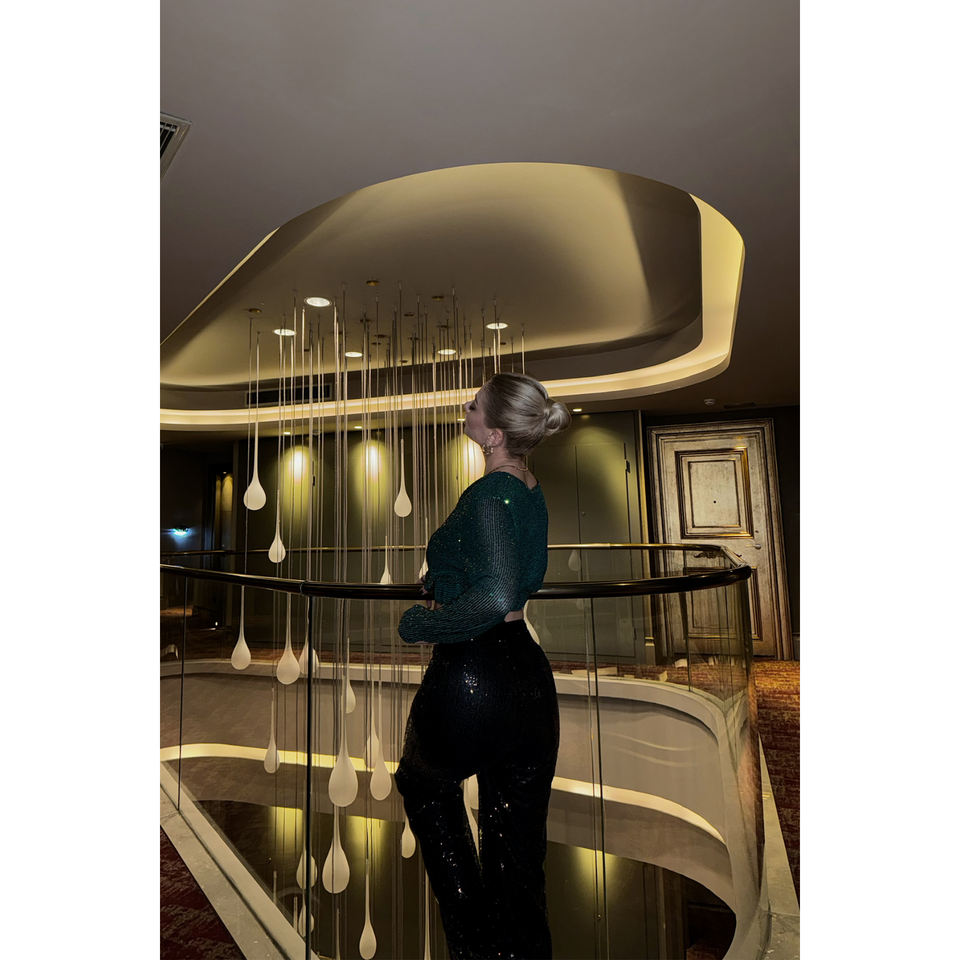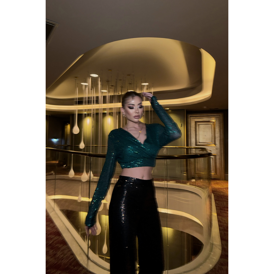 เสื้อชีฟองปักเลื่อมสีเขียวมรกต คอเสื้อแบบอสมมาตร สไตล์เกาหลี ทรงครอปแบบพันรอบตัว พร้อมโลโก้ปัก ฟรีไซส์ XL สไตล์ Y2K
