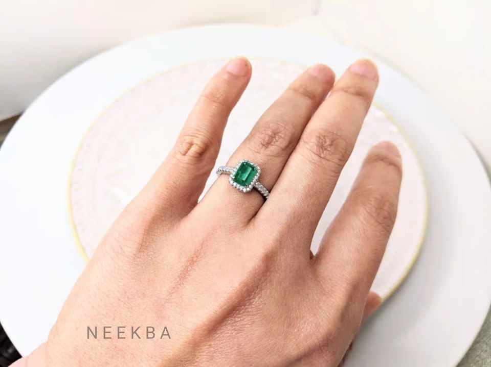 แหวนทองคำสีขาวทึบ10K สร้างจากมรกตรูปทรงมรกตแหวนทองอัญมณีสีเขียวเข้มแหวนดีไซน์รัศมีทำด้วยมือ