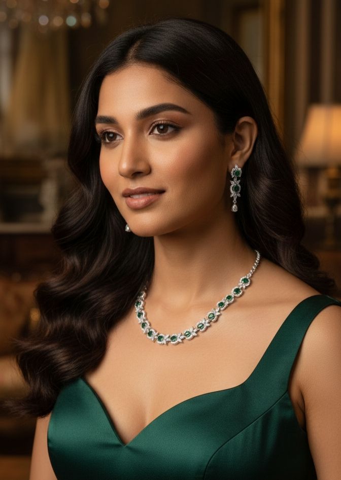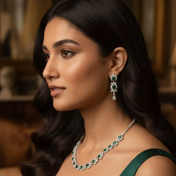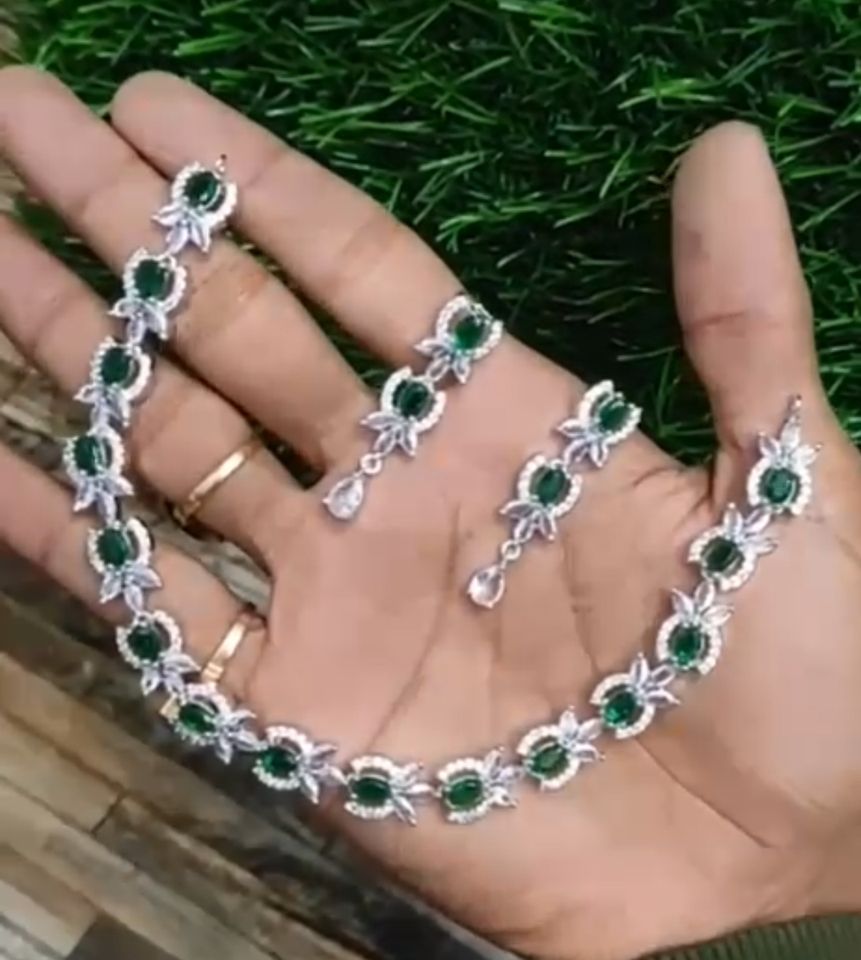 ชุดสร้อยคอและต่างหูมรกตทรงรี ทำจากพลอยมรกตทรงรีสีเขียวมรกตคุณภาพพรีเมียมและพลอยสีขาวระยิบระยับ