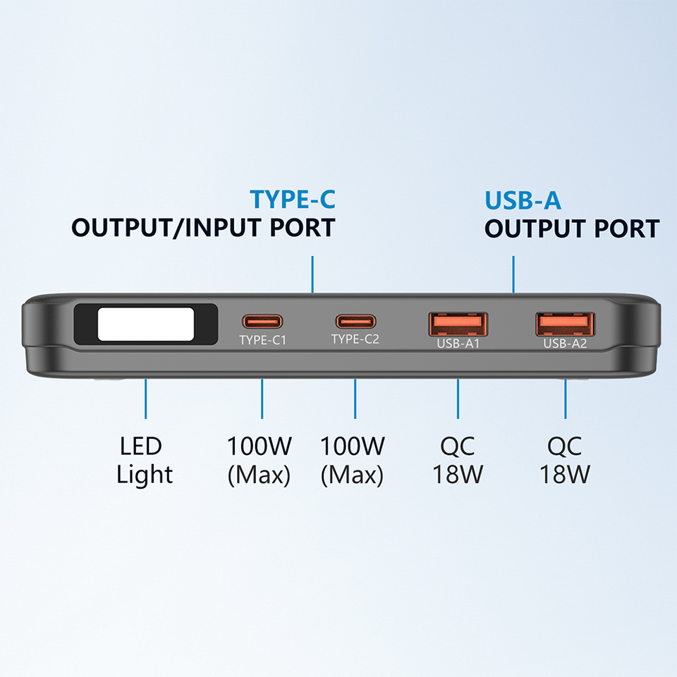 อินพุต Type-C1+C2:5V-3A, 9V-3A, 15V-3A, 20V-5A (สูงสุด 100W)