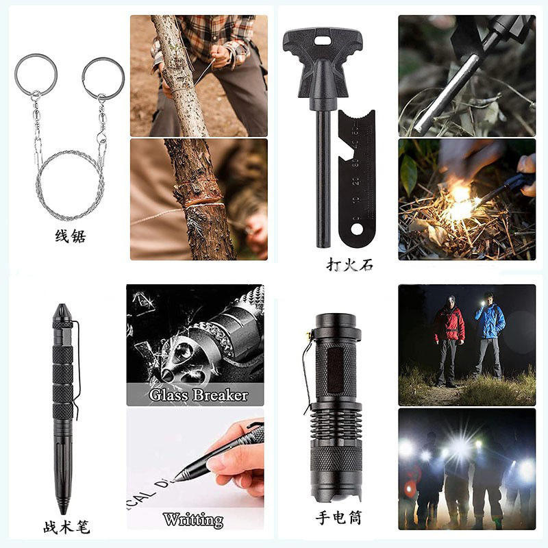 ชุดอุปกรณ์เอาชีวิตรอดฉุกเฉินพร้อมพลั่วอเนกประสงค์ อุปกรณ์ปฐมพยาบาล อุปกรณ์กู้ภัยสำหรับตั้งแคมป์กลางแจ้ง ด้ามจับไนลอนสีดำรูปตัว D
