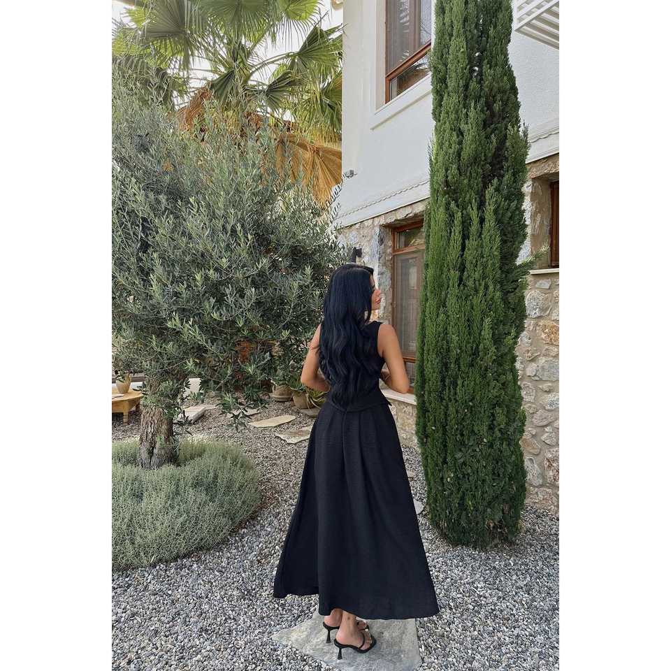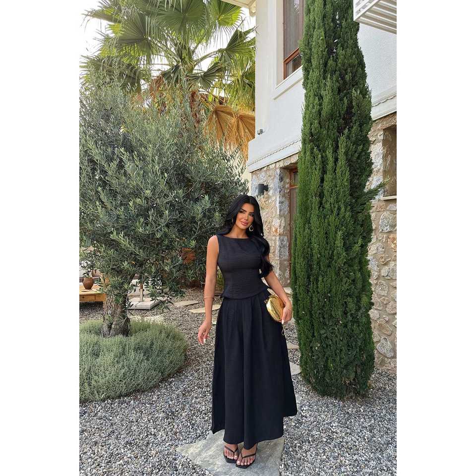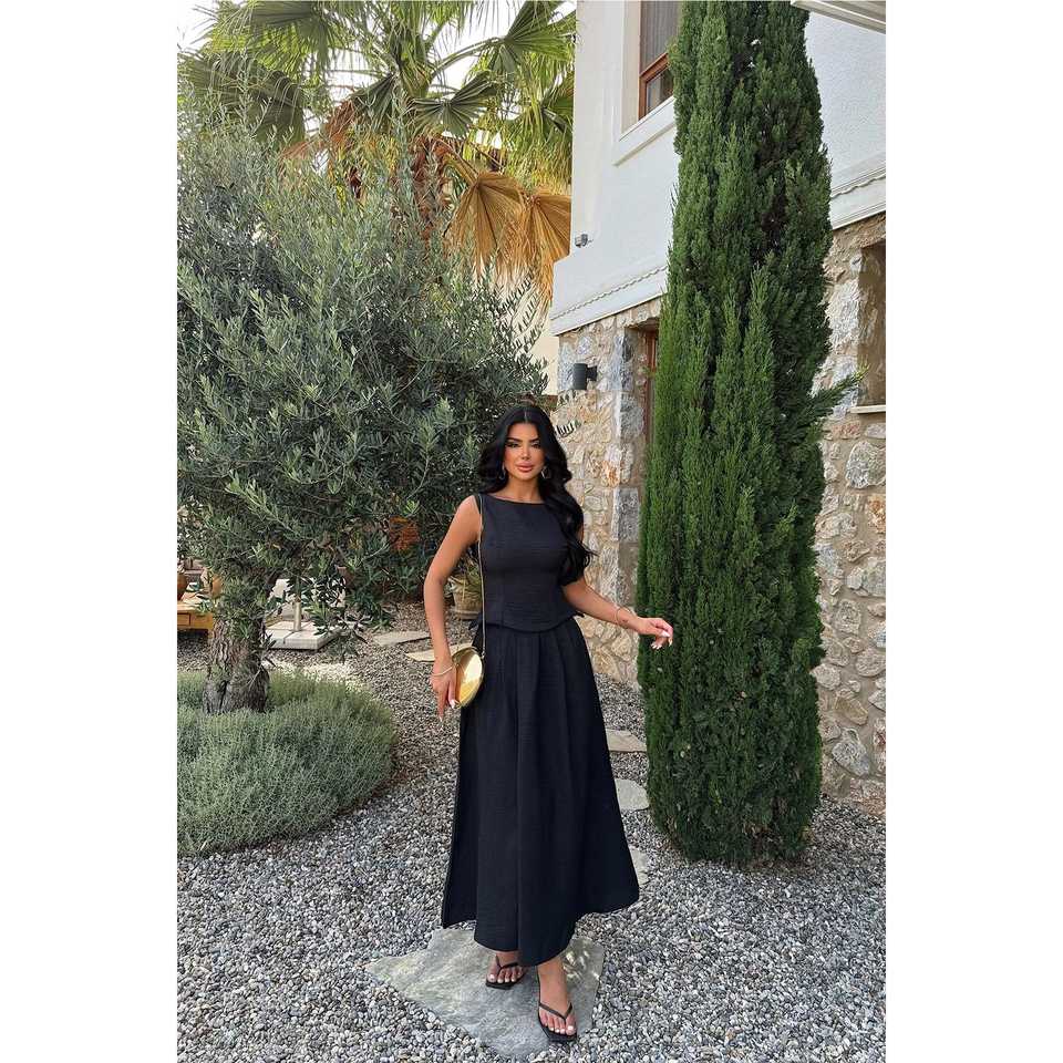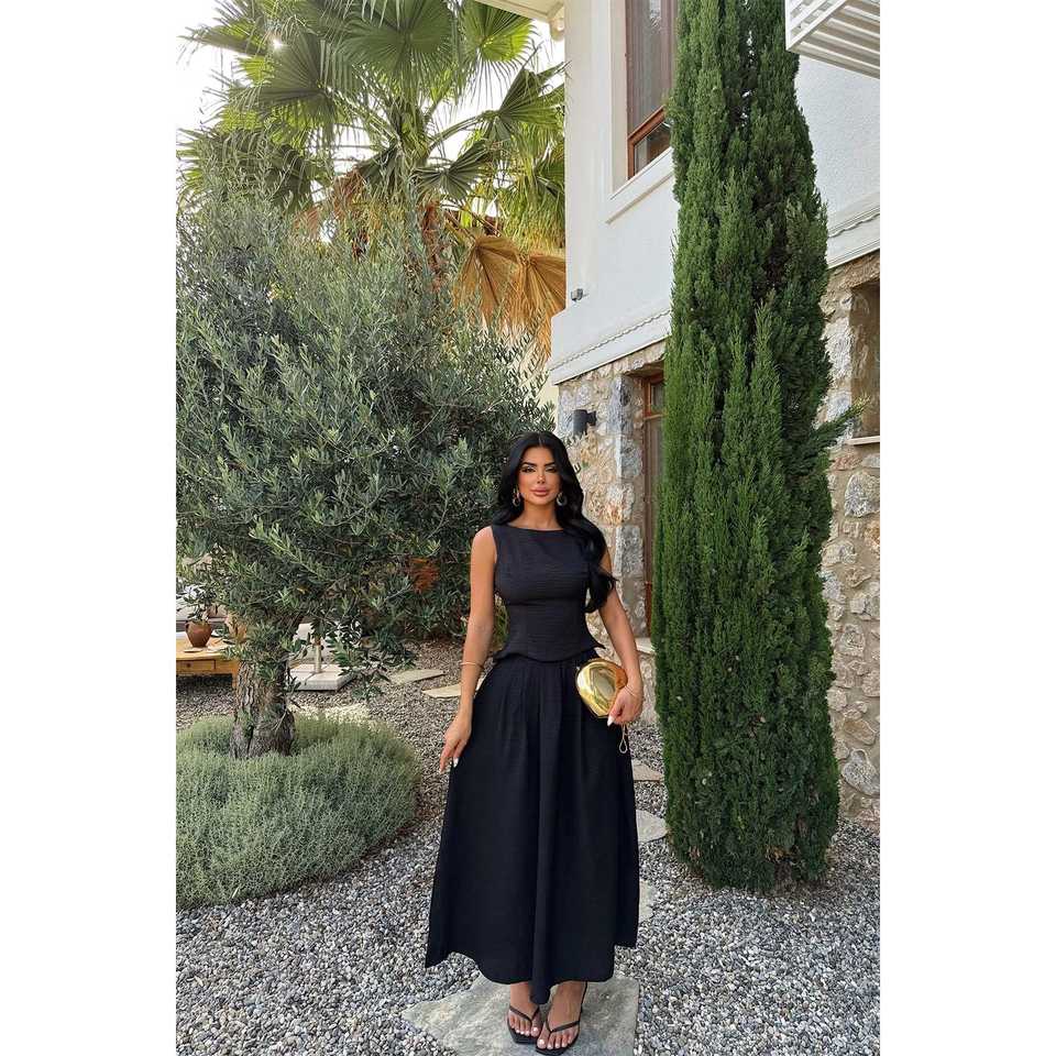 ชุดเดรสวันพีซลายทางสีดำของ Emma พร้อมเสื้อท่อนบนสีพื้น กระโปรงสั้นเหนือเข่า เหมาะสำหรับใส่ไปทำงานหรือไปเที่ยวคลับ ไซส์ XS/XXS สำหรับฤดูร้อน/ฤดูใบไม้ร่วง