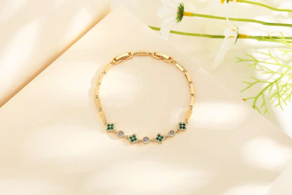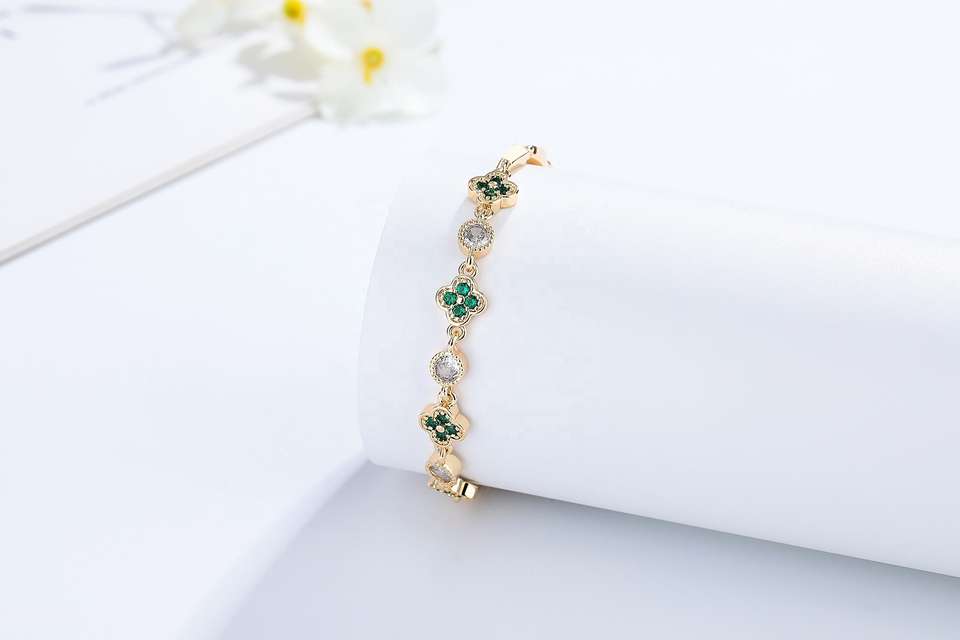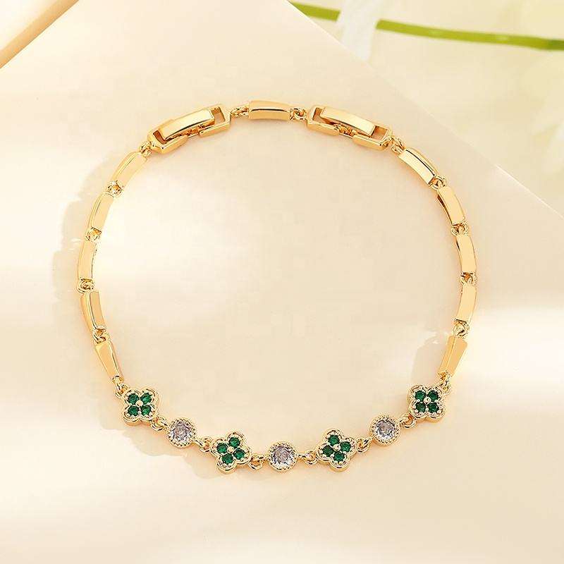 สร้อยข้อมือทอง 18K ชุบทองคำขาว ประดับจี้รูปใบโคลเวอร์สีเขียว ชุดเครื่องประดับใบโคลเวอร์สี่แฉกนำโชคสำหรับผู้หญิง กำลังเป็นที่นิยม ไม่หมองคล้ำ