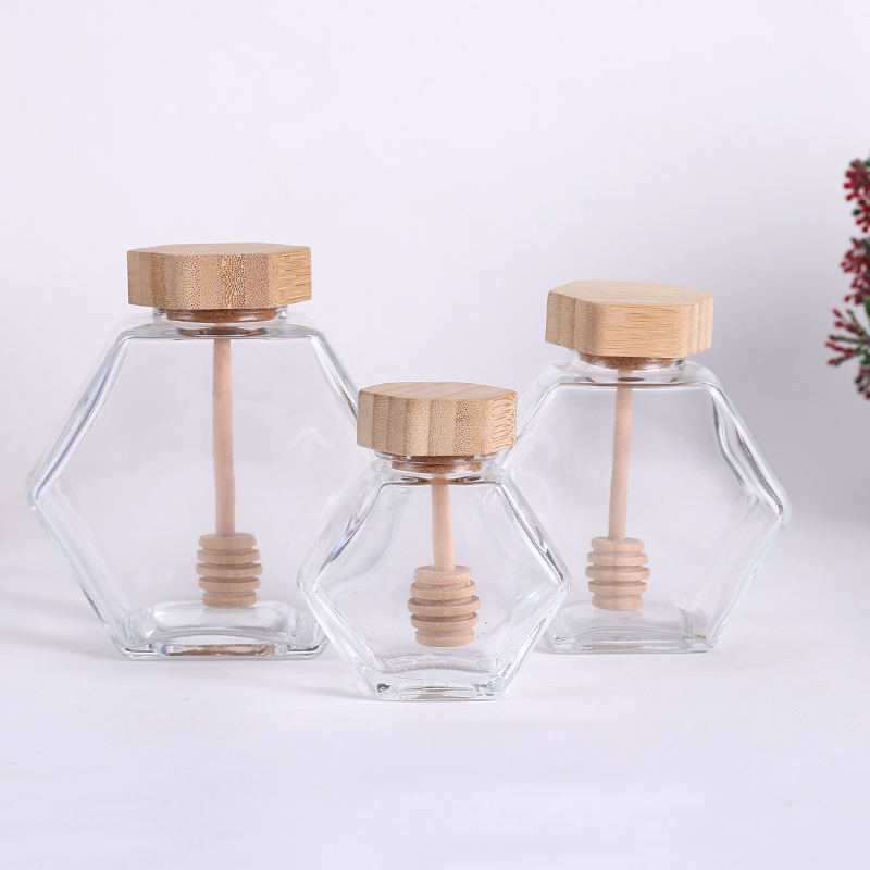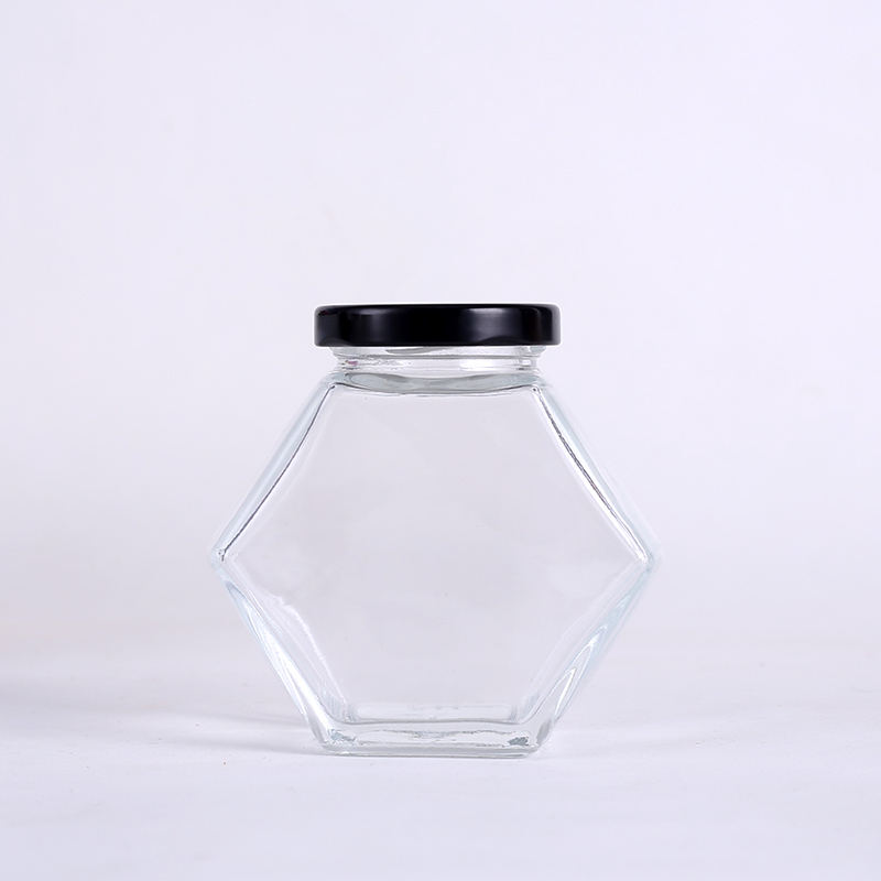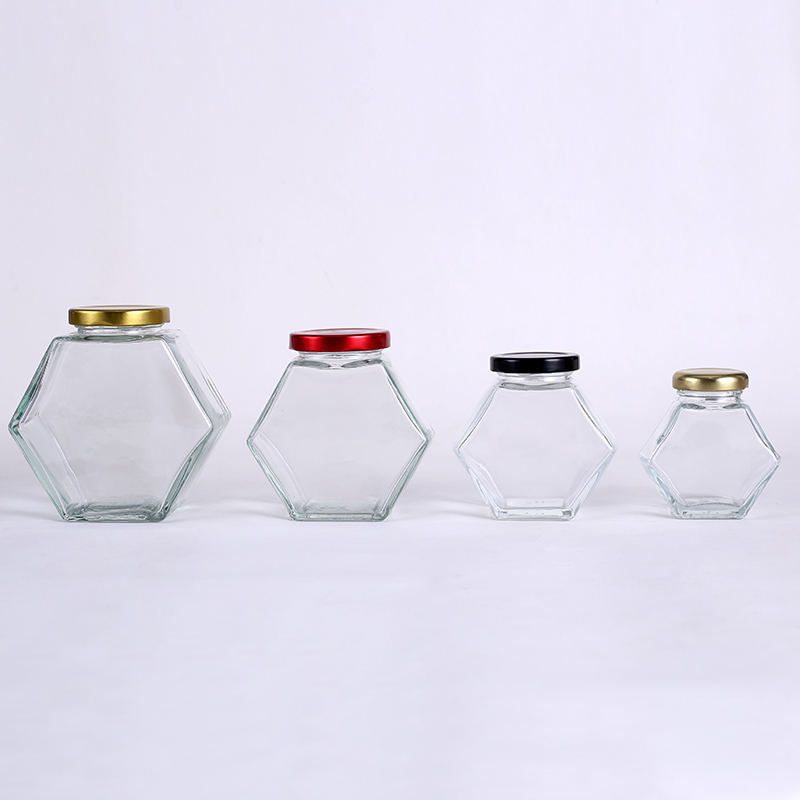 ขวดแก้วใสทรงหกเหลี่ยมขนาด 100 มล. 180 มล. 280 มล. 380 มล. สำหรับใส่ขนมหวาน น้ำผึ้ง อาหารดอง แยม พร้อมฝาโลหะ