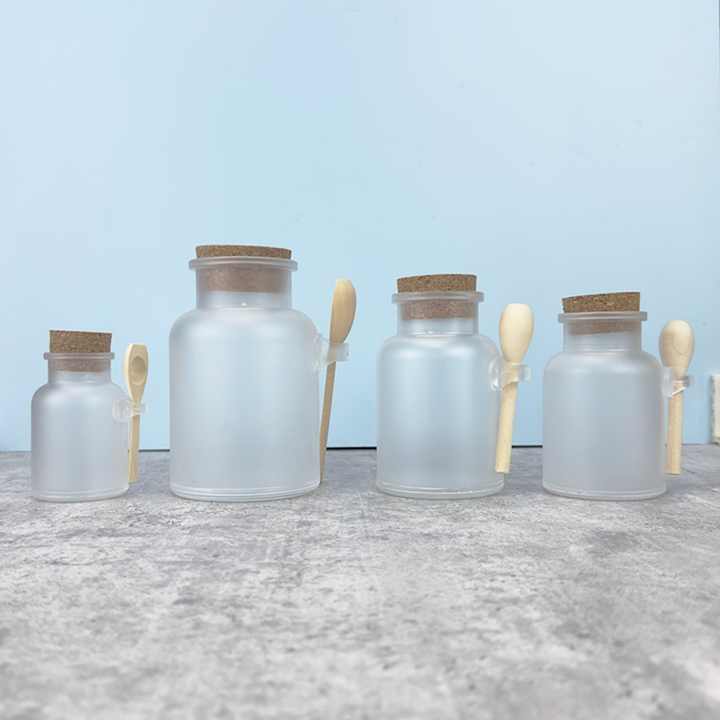 ขวดพลาสติกใส PET ขนาด 100 มล. 200 มล. 300 มล. 500 มล. สำหรับสครับขัดผิว ขวดเกลืออาบน้ำแบบด้าน พร้อมฝาจุกและช้อน บรรจุภัณฑ์เครื่องสำอางพร้อมโลโก้สั่งทำได้