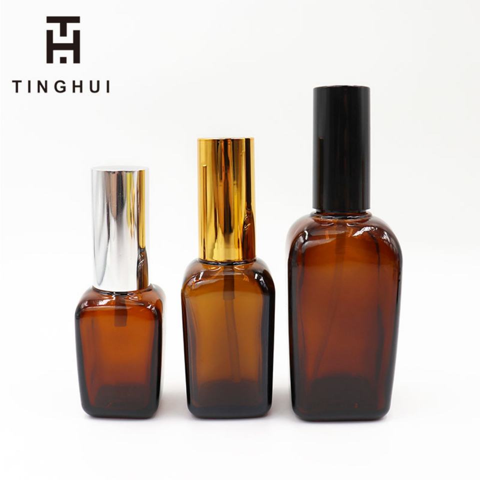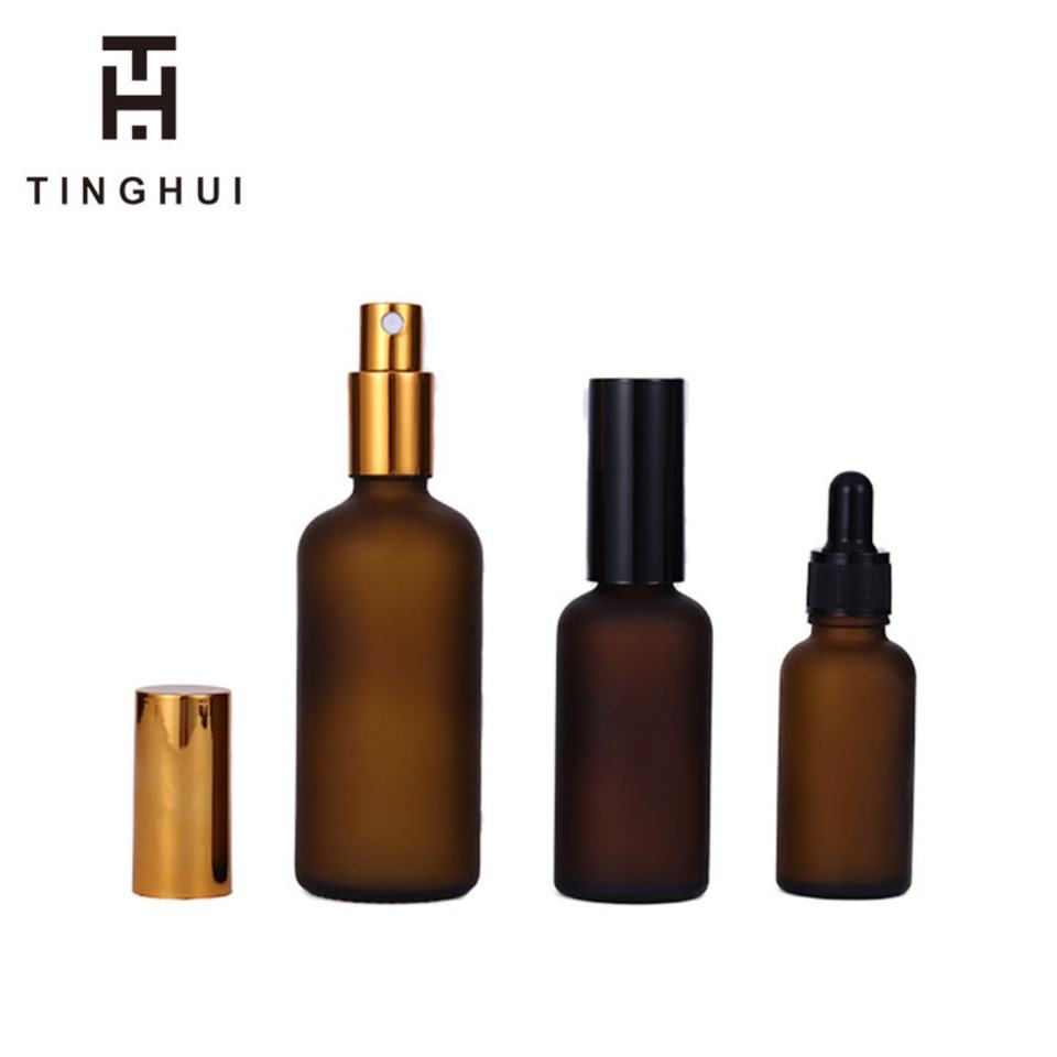 ขวดแก้วใส/ขวดแก้วฝ้าสีเหลืองอำพัน ขนาด 100 มล. 50 มล. 30 มล. 20 มล. 15 มล. 10 มล. 5 มล. สำหรับบรรจุน้ำมันหอมระเหย โลชั่น พร้อมหัวปั๊มและหัวสเปรย์